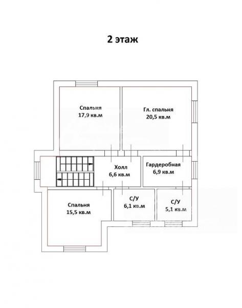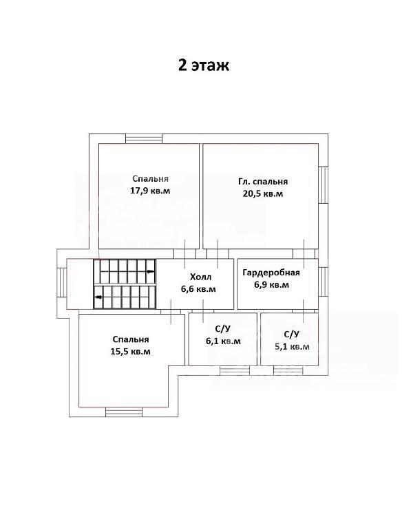 2-ой этаж: холл 6,6 кв.м, мастер-спальня 20,5 кв.м со своими гардеробной 6,9 кв.м и санузлом (с душевой кабиной) 5,1 кв.м, спальня 17.9 кв.м, спальня 15.5 кв м, общий санузел 6.1 кв.м (с ванной).