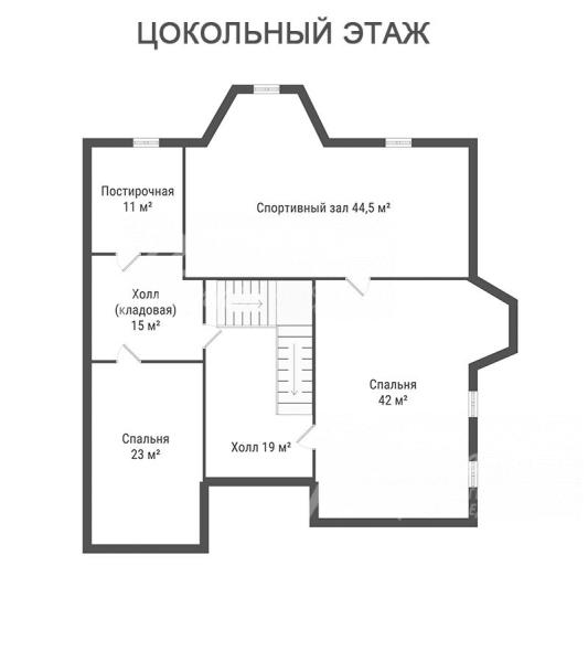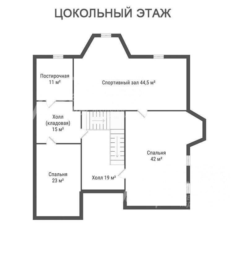 Цоколь: холл 19 кв.м, спортивный зал 44,5 кв.м, комната (спальня) 23 кв.м, комната (спальня) 42 кв.м, постирочная 11 кв.м, холл (кладовая) 15 кв.м