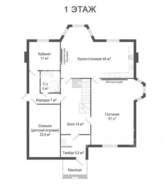 1-ый этаж: крыльцо, тамбур 5,5 кв.м, холл 16 кв.м, гостиная 42 кв.м, кухня-столовая 44,5 кв.м, коридор 7 кв.м с выходом на участок, спальня (кабинет) 11 кв.м, спальня (детская игровая) 23,5 кв.м, санузел 5 кв.м