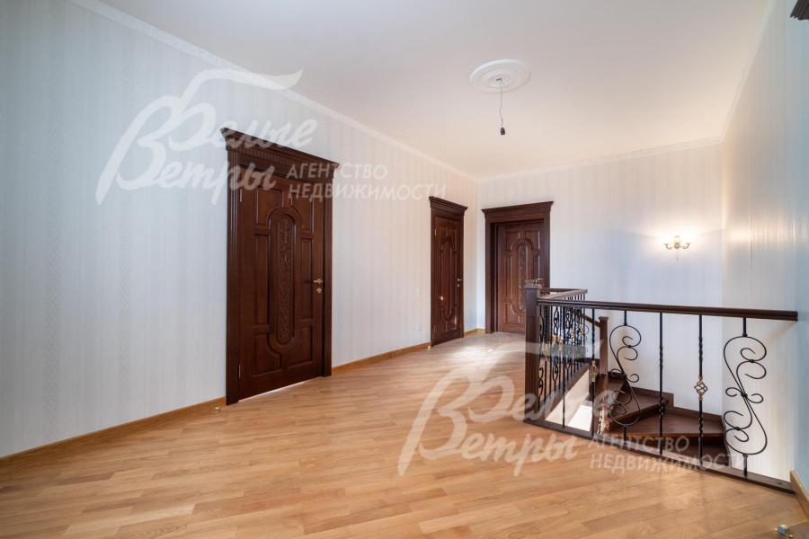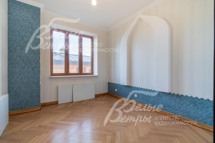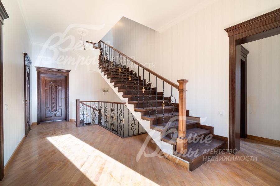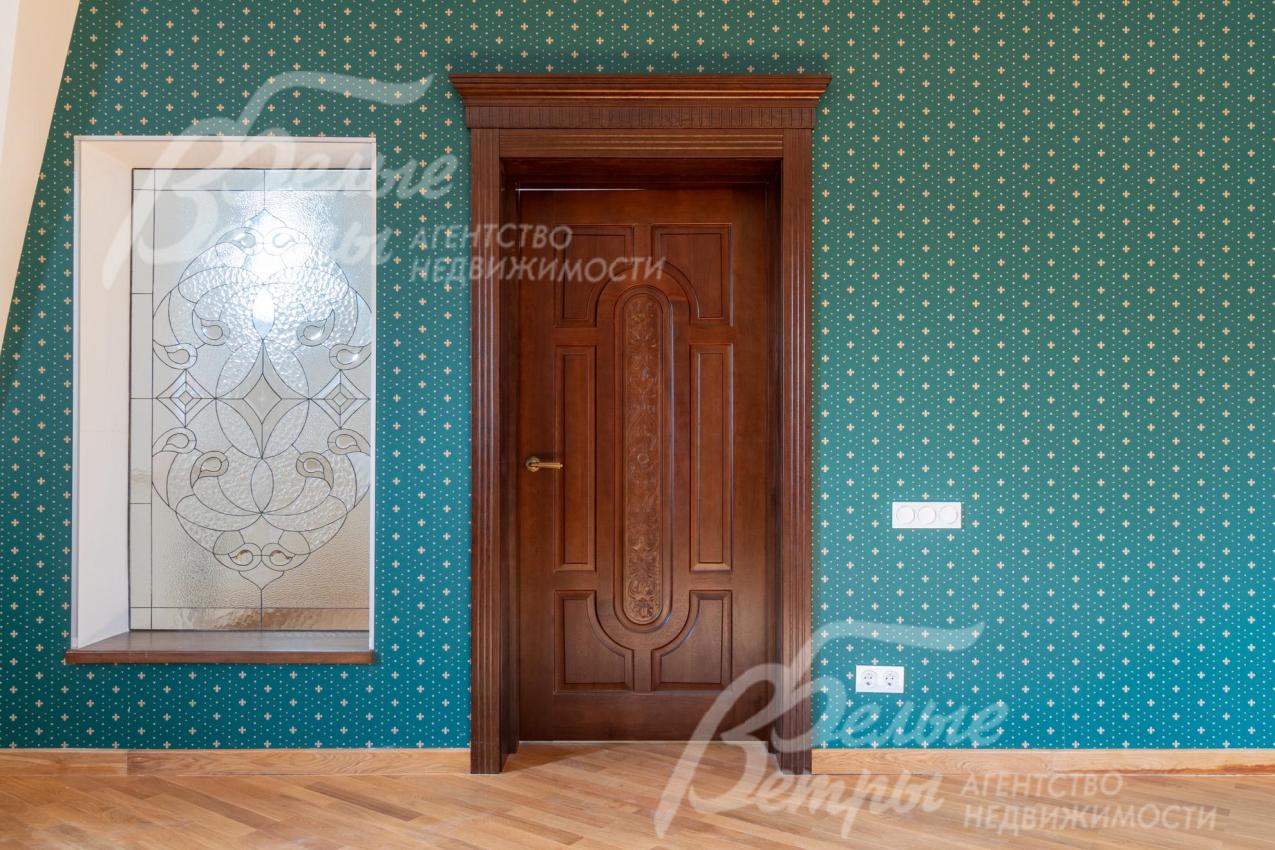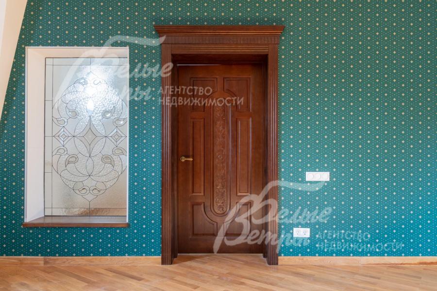 Описание внутренней отделки: интерьер дома оформлен в современном стиле с использованием качественных импортных материалов: декоративная штукатурка в прихожей, обои в остальных помещениях, акцентные стены под кирпич (клинкерная плитка) и дуб (3D-панель) в кухне-столовой и гостиной. Полы преимущественно — паркет из массива дуба с дубовыми плинтусами, в цоколе, на 1-м и 2-м этажах дополнены тёплыми полами (на 2-м этаже — в местах, где керамогранит и мрамор). Потолки окрашены, установлены филёнчатые двери из массива дерева, мраморные подоконники. Лестница выполнена из дуба с кованым ограждением. На мансардном этаже – витражное остекление по технологии «Тиффани»