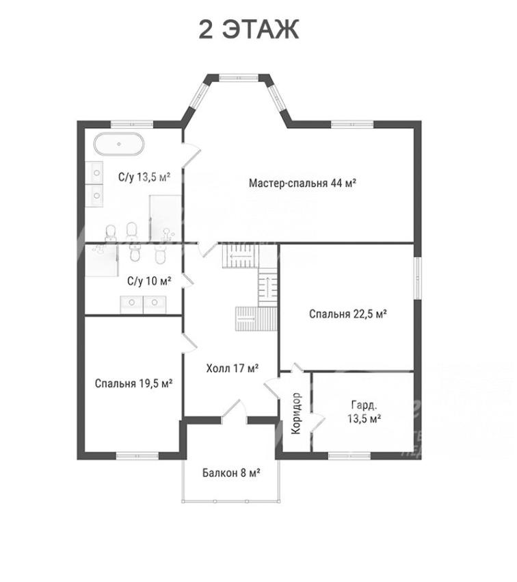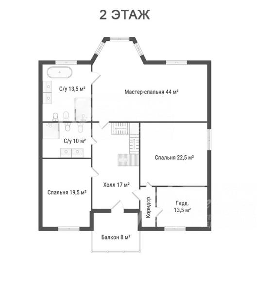 2-ой этаж: холл 17 кв.м с выходом на балкон 8 кв.м, мастер-спальня 44,5 кв.м с санузлом 13,5 кв.м и возможностью сделать гардеробную, коридор, спальня 22,5 кв.м с гардеробной 13,5 кв.м, спальня 19,5 кв.м, санузел 10 кв.м