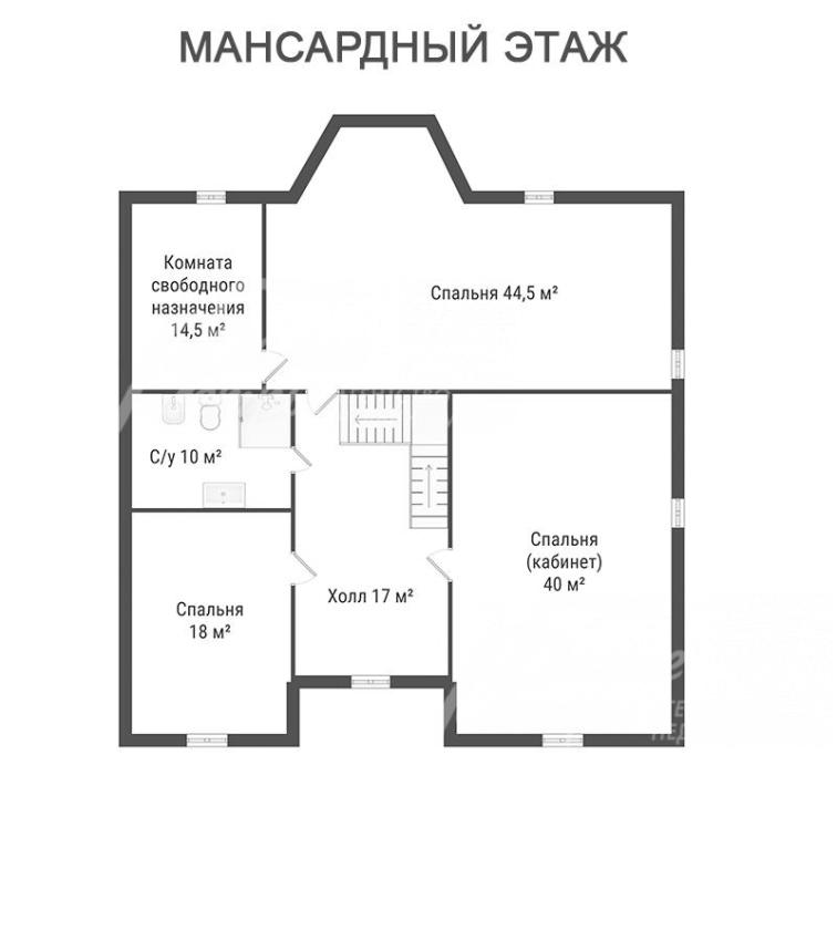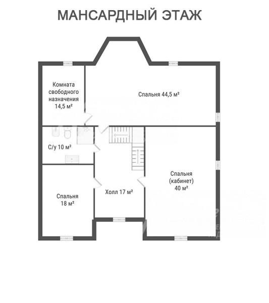 3-ий этаж: мансардный этаж: холл 17 кв.м, спальня 18 кв.м, спальня 44,5 кв.м с комнатой свободного назначения 14,5 кв.м, спальня (кабинет) 40 кв.м, санузел 10 кв.м