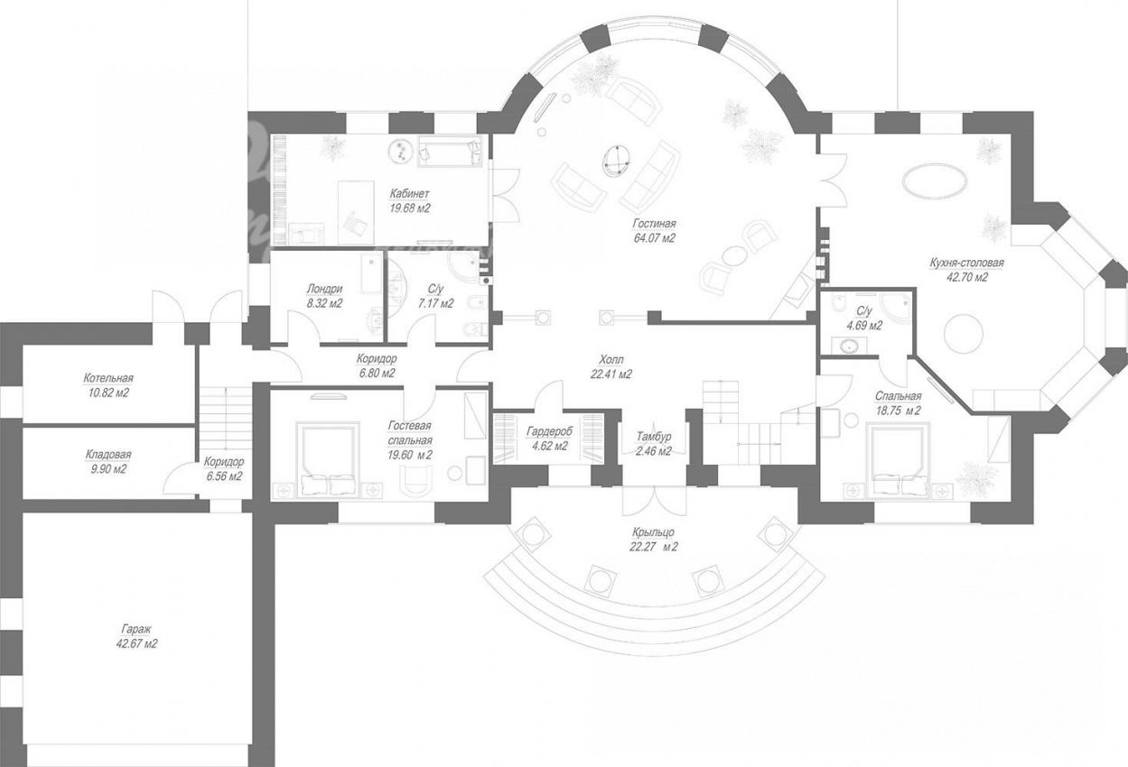 1-ый этаж: свободная планировка. Предлагается следующий вариант: крыльцо 22 кв.м, тамбур, гардероб 5 кв.м, светлый холл 22 кв.м, большая гостиная 64 кв.м, кабинет 20 кв.м, кухня-столовая 43 кв.м с эркерным окном, спальня 19 кв.м со своим санузлом 5 кв.м, коридор 7 кв.м, гостевая спальня 20 кв.м, постирочная 8 кв.м, санузел 7 кв.м, гараж 43 кв.м на 2 авто, кладовая 10 кв.м, котельная 11 кв.м с отдельным входом.