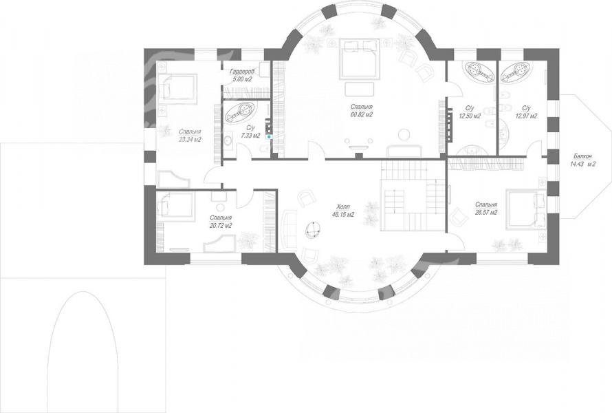 2-ой этаж: свободная планировка. Предлагается следующий вариант: холл-гостиная 46 кв.м, мастер спаьня 61 кв.м со своим санузлом 13 кв.м, спальня 27 кв.м со своим санузлом 13 кв.м, спальня 23 кв.м с гардеробной 5 кв.м, спальня 21 кв.м, санузел общий 7 кв.м.