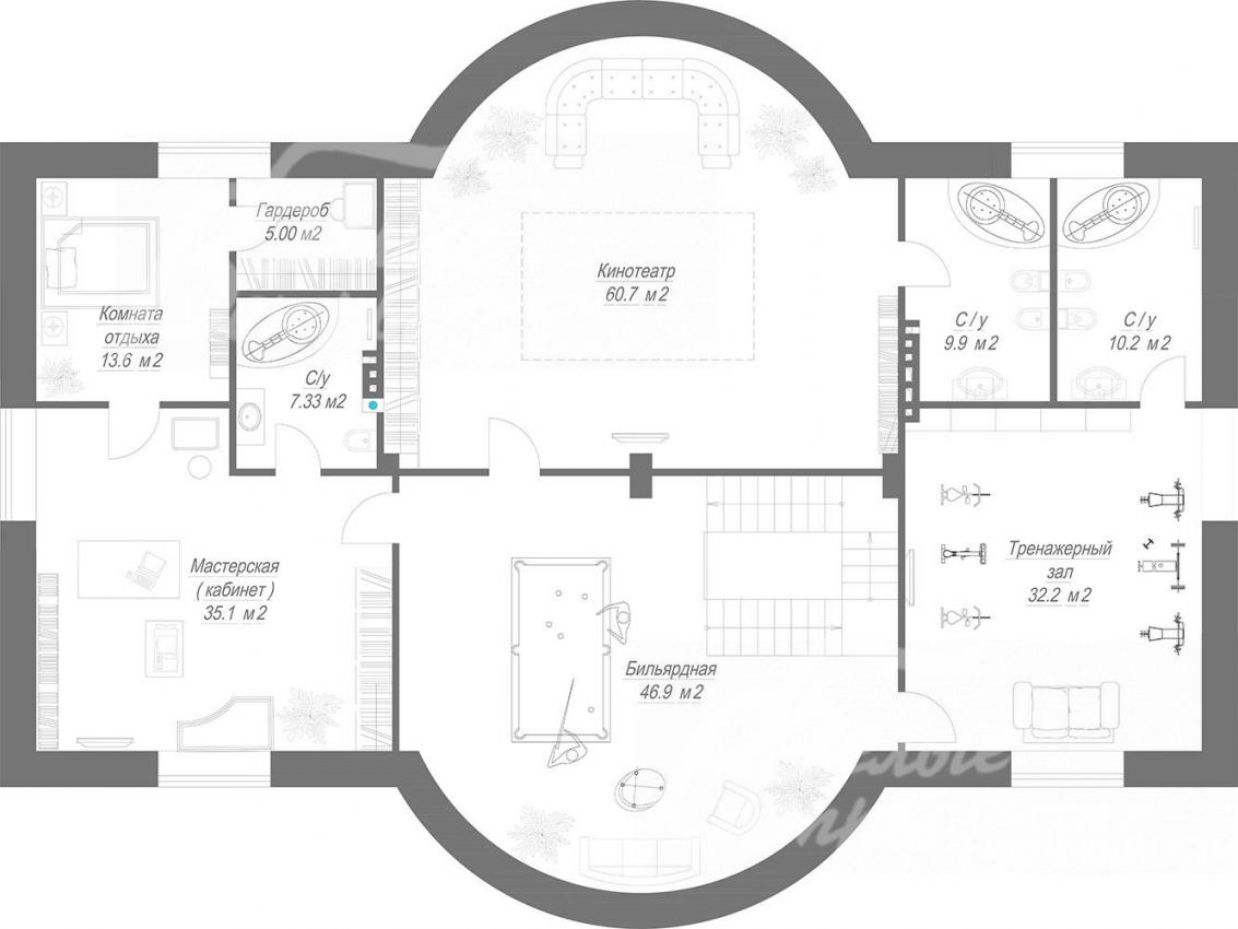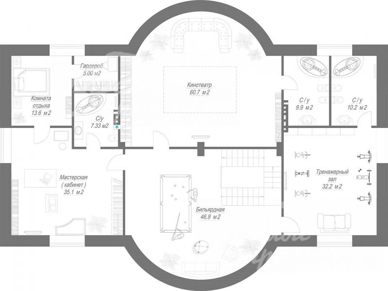 3-ий этаж: свободная планировка. Предлагается следующий вариант: бильярдная 47 кв.м, тренажерный зал 32 кв.м с санузлом 10 кв.м, кинотеатр 61 кв.м с санузлом 10 кв.м, мастерская (кабинет) 35 кв.м с санузлом 7 кв.м и комнатой отдыха 14 кв.м с гардеробной 5 кв.м.