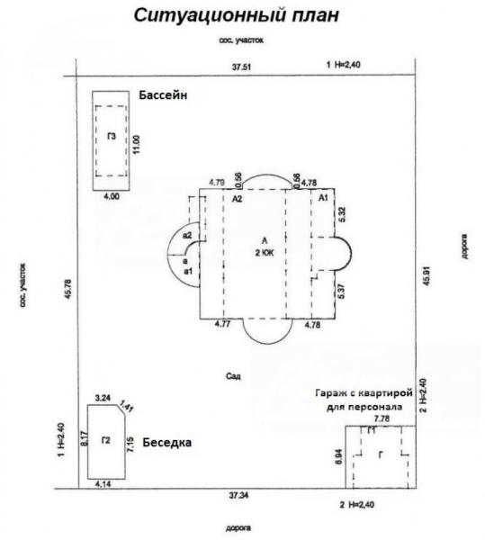 Дополнительные строения: Гараж с квартирой для персонала 70.5 кв.м (один этаж 40 кв.м + мансарда - тамбур 3 кв.м, жилая комната 19 кв.м, кухня, с/узел 3 кв.м).