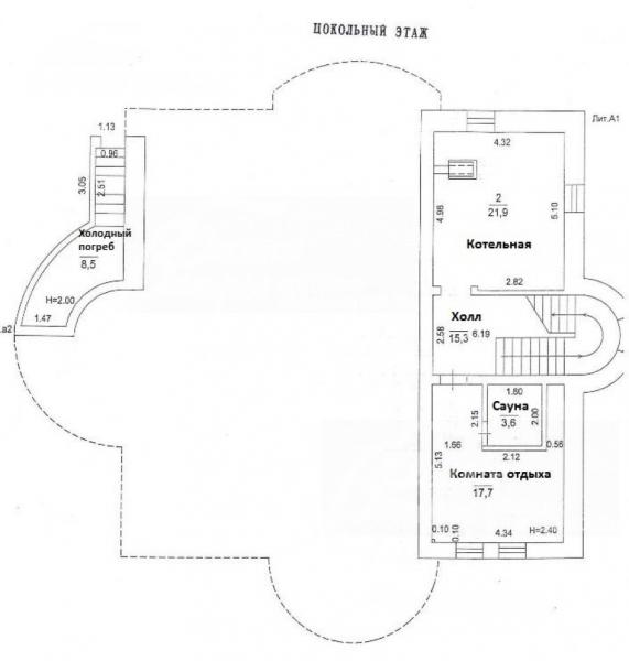 Цоколь: холл 15 кв.м, котельная 22 кв.м, комната отдыха 18 кв.м, сауна 3.6 кв.м, холодный погреб 8.5 кв.м с отдельным входом