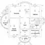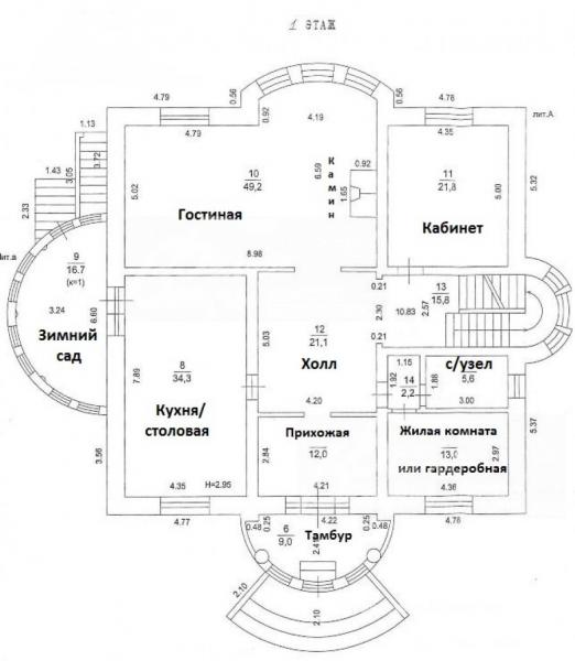 1-ый этаж: тамбур 9 кв.м, прихожая 12 кв.м, гостиная 49 кв.м с камином и эркером, кухня-столовая 34 кв.м с выходом в зимний сад 17 кв.м, холл 21 кв.м, жилая комната 13 кв.м (либо гардеробная), кабинет 22 кв.м, с/узел 5,6 кв.м