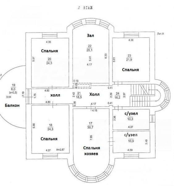 2-ой этаж: зал 28 кв.м, спальня хозяев 31 кв.м с с/узлом 11 кв.м, большой холл с выходом на полукруглый балкон 17 кв.м, две зеркально расположенных спальни по 24 кв.м, с/узел 10 кв.м, спальня 22 кв.м