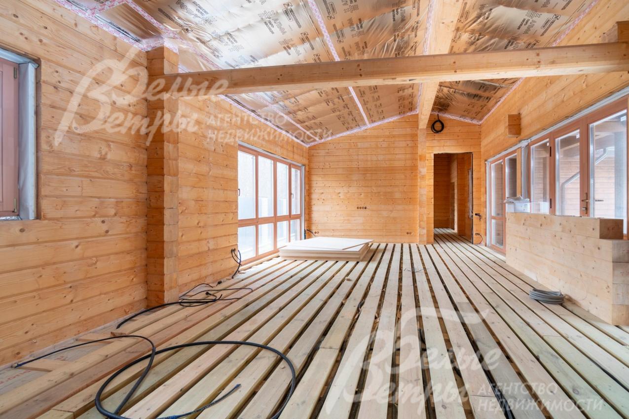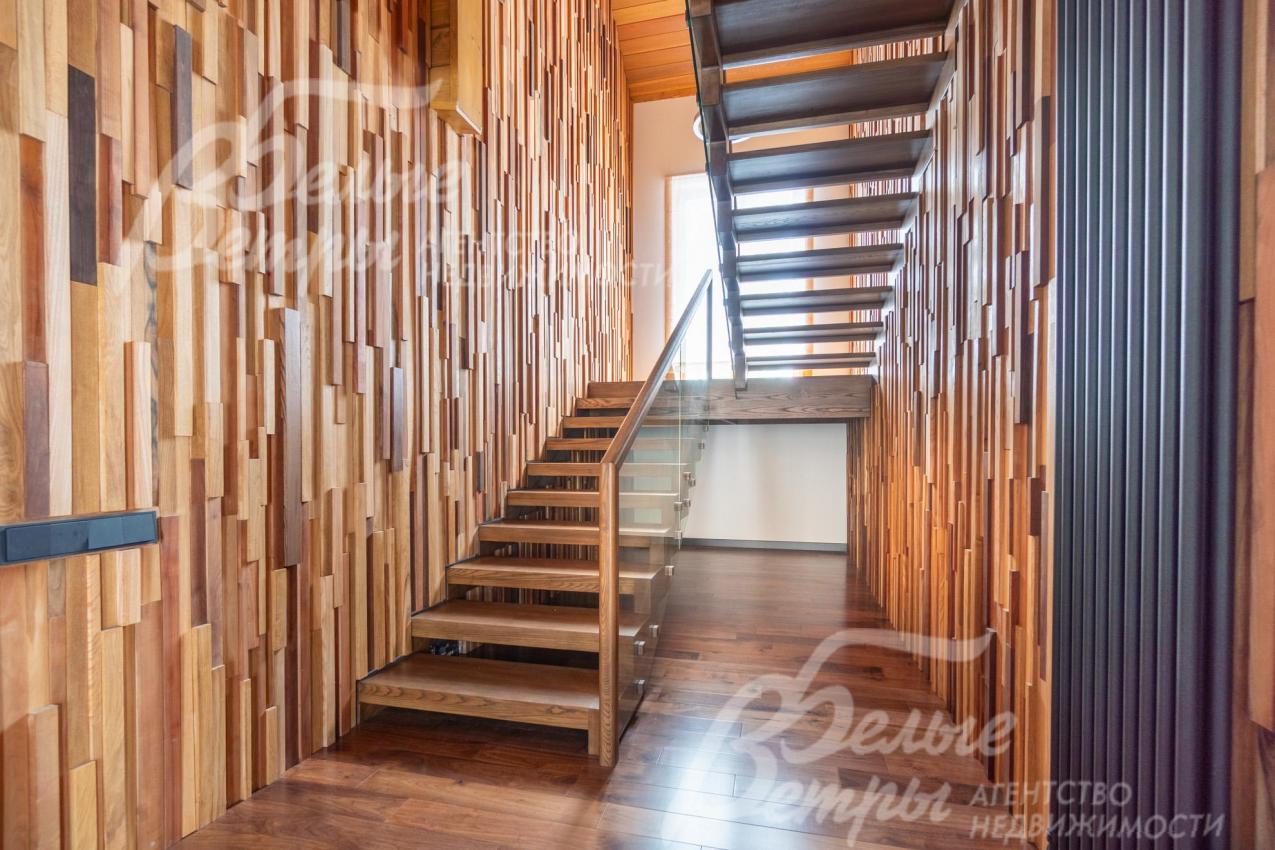 Описание внутренней отделки: пространство дома оформлено в современной эстетике. Внутренняя отделка стен сочетает дерево и краску, панно из ценных пород создают выразительные акценты в лестничном холле и кинозале. Полы выложены итальянским керамогранитом с индивидуальным подбором рисунка и массивом американского ореха. Потолки комбинированные: дерево и гипсокартон. Установлены деревянные подоконники и дорогостоящие межкомнатные двери Union скрытого монтажа (высота 2,35 м) с вставками из ценных пород дерева. На второй этаж ведет лестница из массива дуба