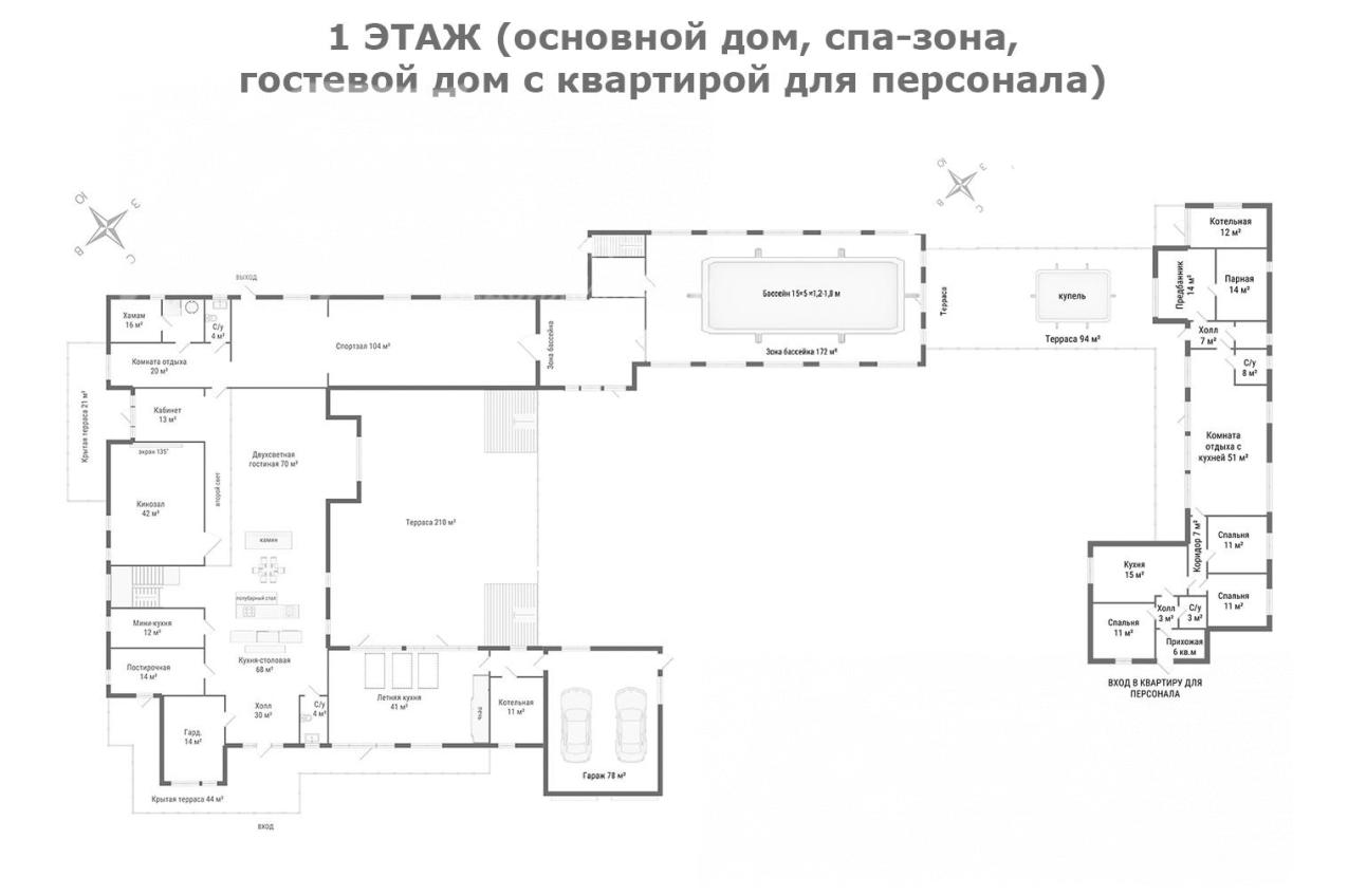 1-ый этаж: холл 30 кв.м, двухсветная гостиная 70 кв.м, кухня-столовая 68 кв.м, кинозал 42 кв.м, кабинет 13 кв.м с выходом на крытую террасу 21 кв.м, хамам 16 кв.м, комната отдыха 20 кв.м, спортзал 104 кв.м с выходом на участок и с выходом в зону бассейна, санузел 4 кв.м, летняя кухня с печью 41 кв.м с выходом крытую террасу 44 кв.м и террасу 210 кв.м, котельная 11 кв.м, мини-кухня 12 кв.м, постирочная 14 кв.м с выходом на крытую террасу, гардеробная 14 кв.м, санузел 4 кв.м, гараж 78 кв.м;