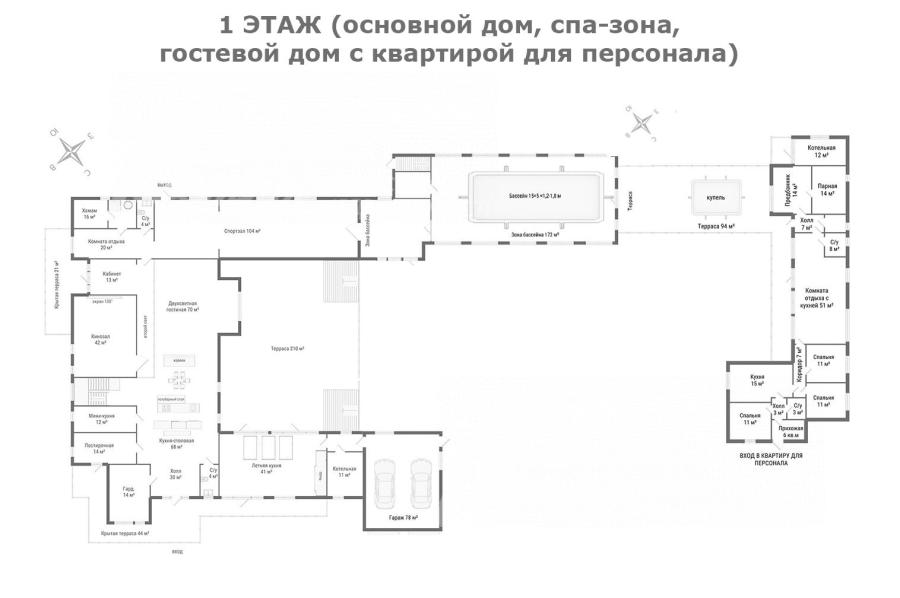 спа-зона с гостевым домом: холл 7 кв.м, бассейн 172 кв.м, предбанник 14 кв.м, парная 14 кв.м, комната отдыха с кухней 51 кв.м, коридор 7 кв.м, спальня 11 кв.м, спальня 11 кв.м, санузел 8 кв.м, котельная 12 кв.м, терраса 94 кв.м с купелью;