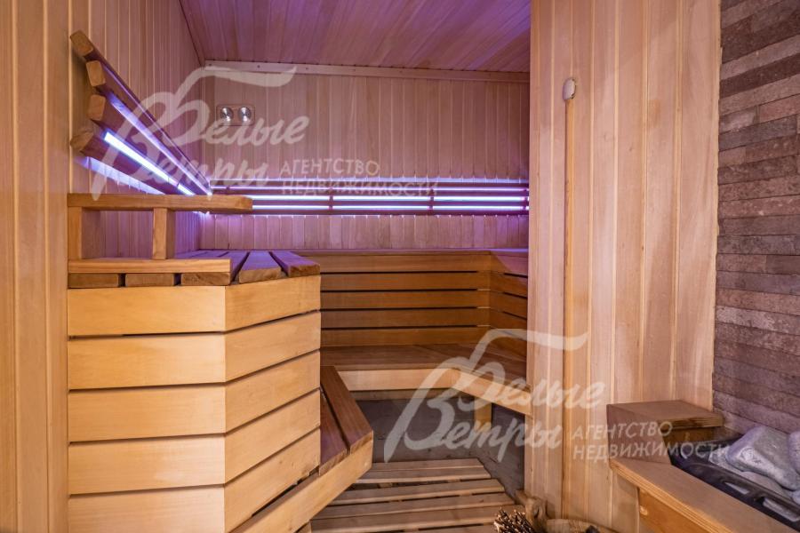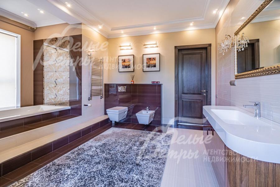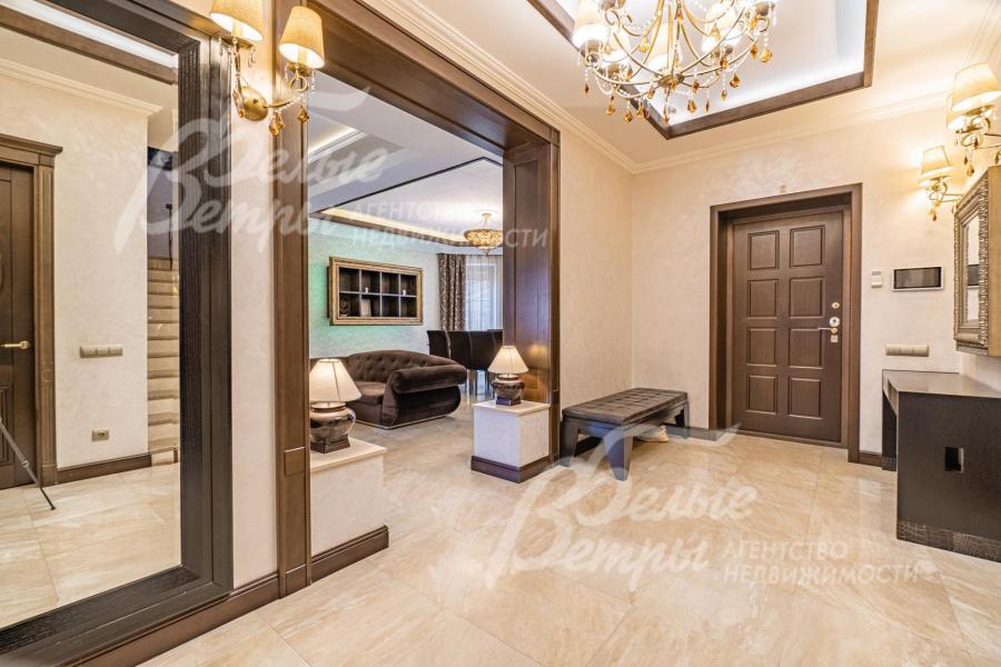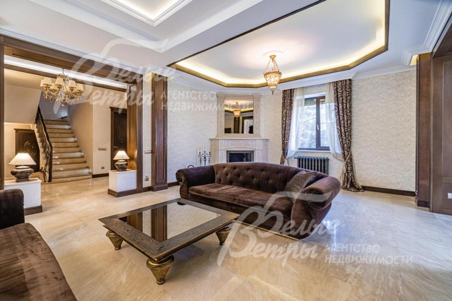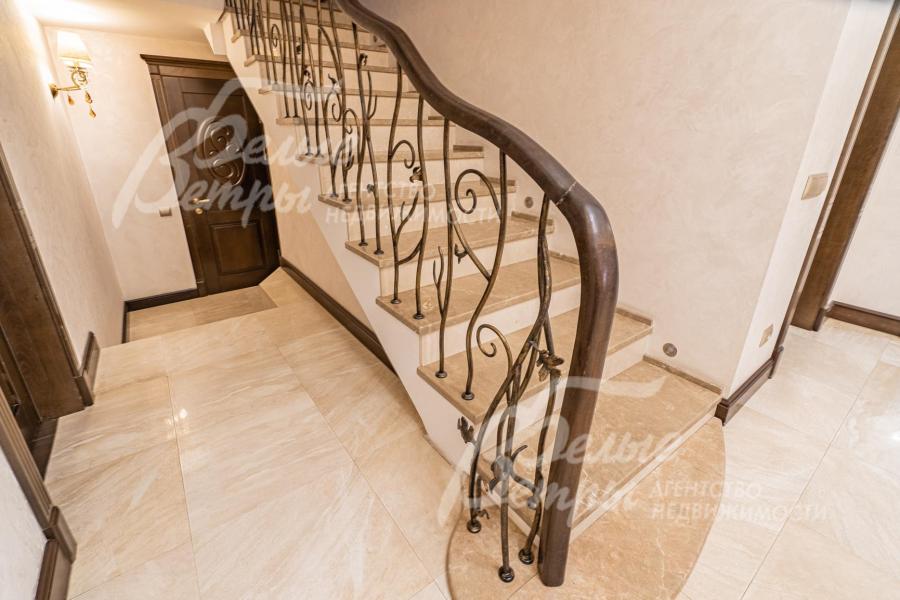 Описание внутренней отделки: классическая отделка с элементами модерна; стены покрашены; на полу импортная плитка и доска из дуба; лестница монолитная, отделана мрамором, с кованым ограждением и поручнем из дуба; потолки ГКЛ многоуровневые с подсветкой по периметру и встроенными светильниками; Вся сантехника установлена, смесители фирмы GESSI (Италия), GROHE и hansgrohe (Германия), DURAVIT (Германия) и другие европейские марки; теплые полы везде где плитка. На 1 этаже чугунные радиаторы в ретро-стиле; электричество разведено; двери из массива каштана (2.15 м); все подоконники в доме из мрамора, на кухне из гранита CREMA MAREFIL; сауна из абаша с подсветкой разными цветами (Цветотерапия), дровяной камин, отделан мрамором;