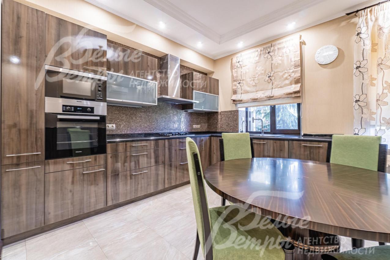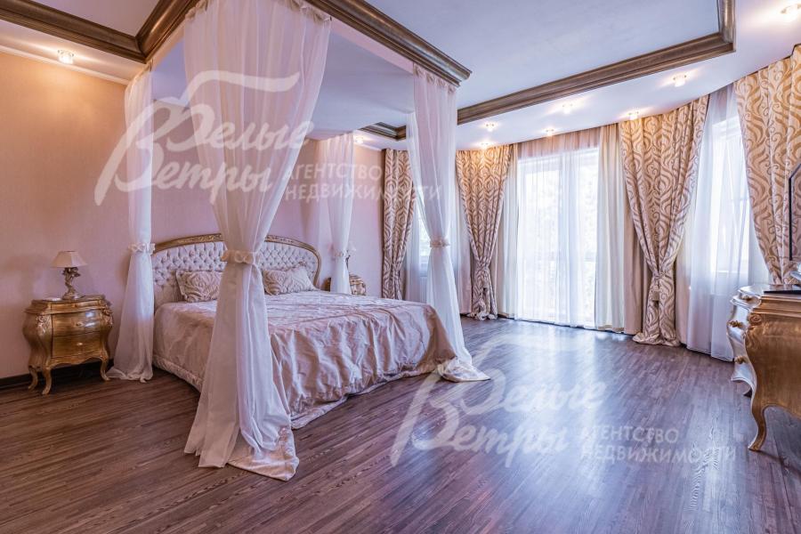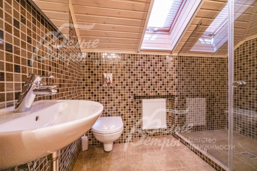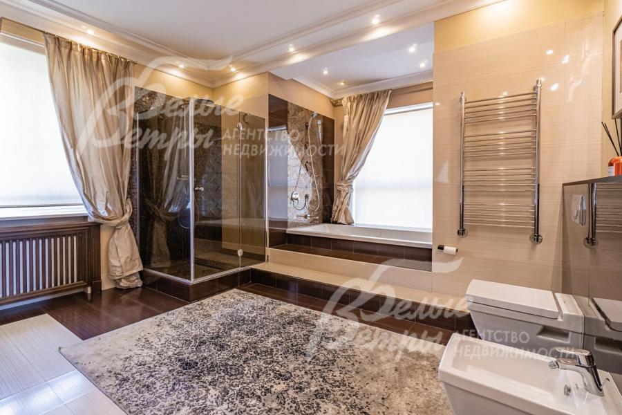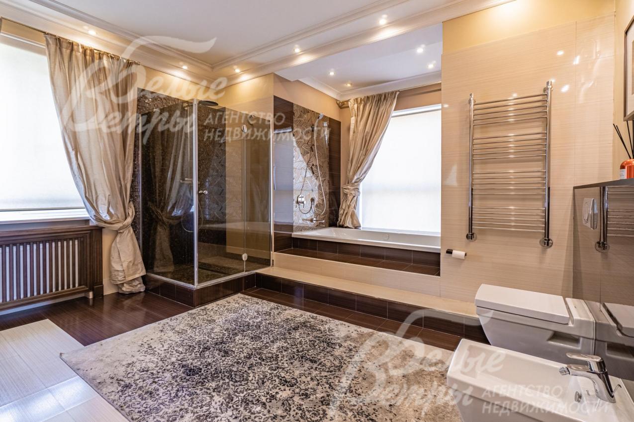 Описание внутренней отделки: классическая отделка с элементами модерна; стены покрашены; на полу импортная плитка и доска из дуба; лестница монолитная, отделана мрамором, с кованым ограждением и поручнем из дуба; потолки ГКЛ многоуровневые с подсветкой по периметру и встроенными светильниками; Вся сантехника установлена, смесители фирмы GESSI (Италия), GROHE и hansgrohe (Германия), DURAVIT (Германия) и другие европейские марки; теплые полы везде где плитка. На 1 этаже чугунные радиаторы в ретро-стиле; электричество разведено; двери из массива каштана (2.15 м); все подоконники в доме из мрамора, на кухне из гранита CREMA MAREFIL; сауна из абаша с подсветкой разными цветами (Цветотерапия), дровяной камин, отделан мрамором;