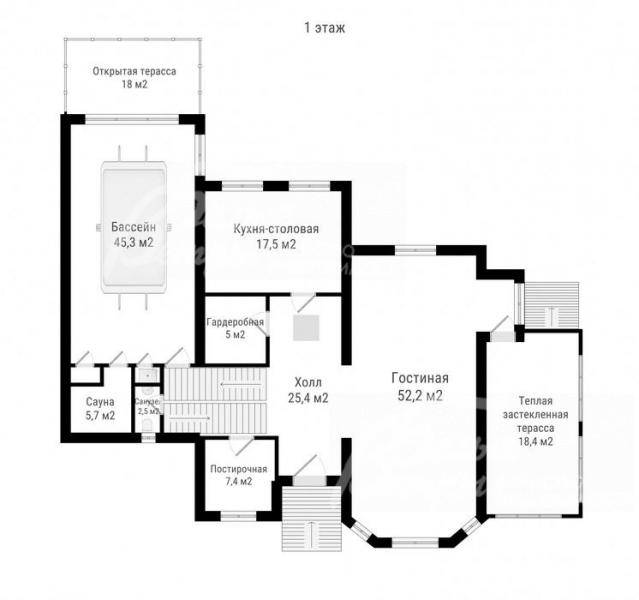 1-ый этаж: холл 25.4 кв.м, кухня-столовая 17.5 кв.м, гостиная 52.2 кв.м, постирочная 7.4 кв.м, гардеробная 5 кв.м, бассейн 45.3 кв.м, сауна 5.7 кв.м, санузел 2.5 кв.м, терраса 18.4 кв.м