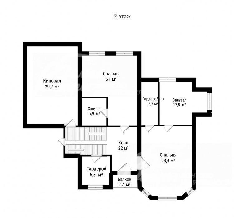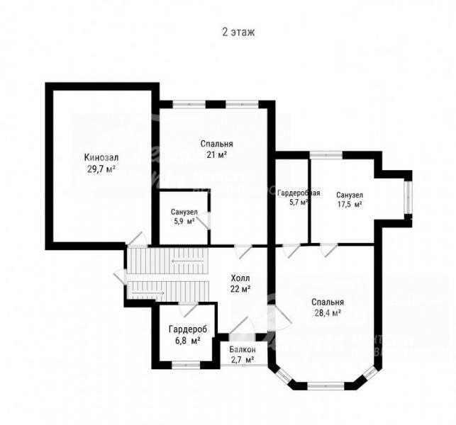 2-ой этаж: холл 22 кв.м, кинозал 29.7 кв.м, спальня 28.4 кв.м со своим санузлом 17.5 кв.м и гардеробной 5.7 кв.м, спальня 21 кв.м со своим санузлом 6.8 кв.м, гардеробная 6.8 кв.м, балкон 2.7 кв.м