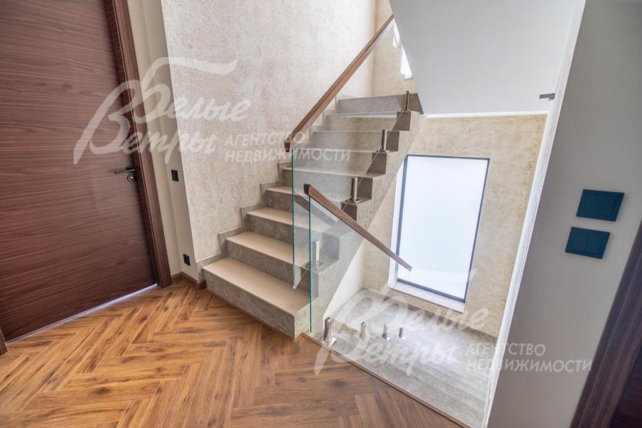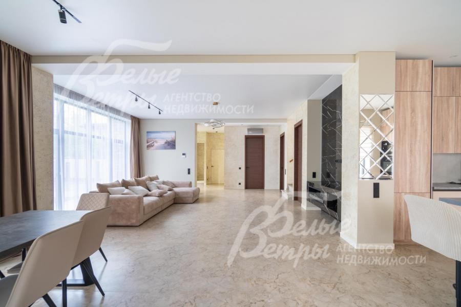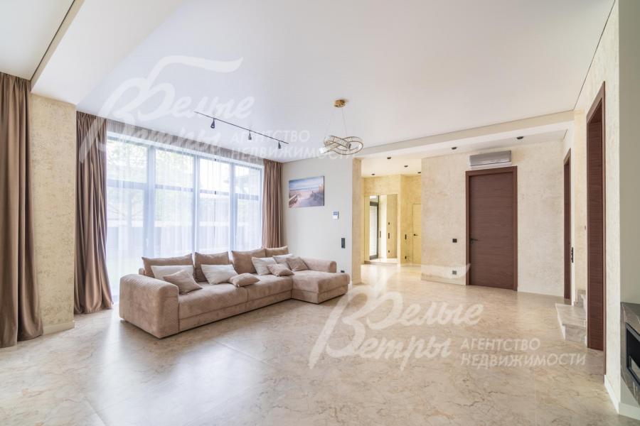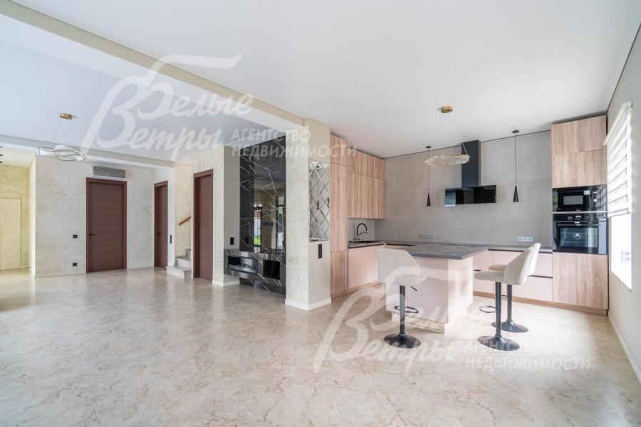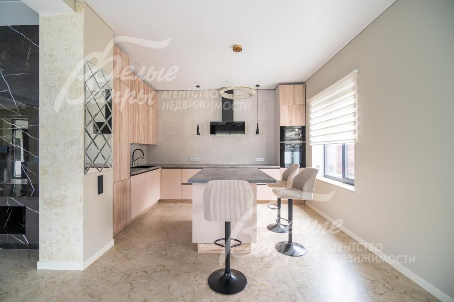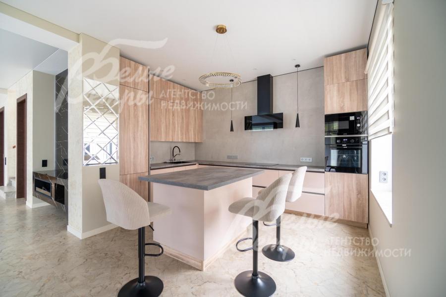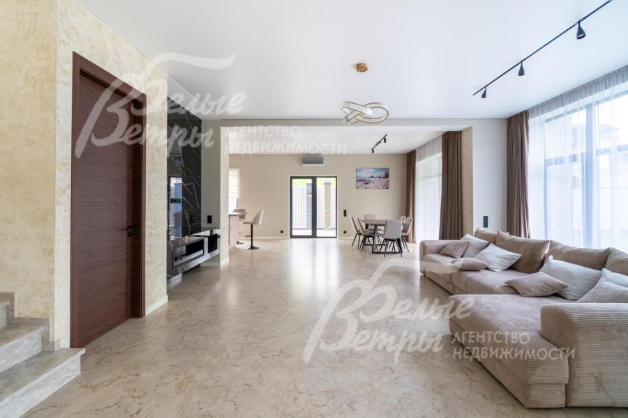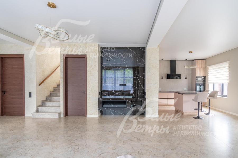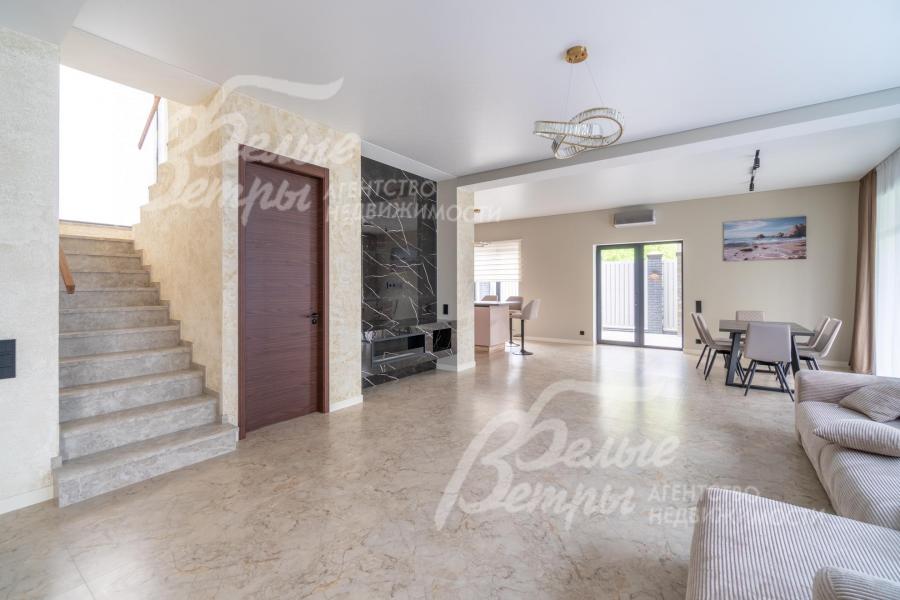 Описание внутренней отделки: интерьер выполнен в современном стиле в светло-бежевых тонах с использованием премиальных материалов и стильных дизайнерских решений. На стенах спален и общих помещений – декоративная антивандальная штукатурка в 3 слоя, имитирующая камень травертин, керамогранит (в санузлах), имитирующий слепок ригеля черного цвета, покраска стен в комнатах. На полу – крупноформатный керамогранит под мрамор на первом этаже и в санузлах на 2 этаже (под керамогранитом – тёплые водные полы), инженерная доска (кладка елочкой). Установлены натяжные потолки, двери из шпона натурального дерева высотой 2,4 м, подоконники под мрамор, трековое освещение черного цвета и светодиодная подсветка, электрика Schneider Electric черного цвета, интернет проводной и ТВ кабель для точек и до рабочих мест. На второй этаж ведёт монолитная лестница: ступени из керамогранита под мрамор с капиносом, ограждение – прозрачные перила с дубовыми поручнями. Гостиную украшает биокамин, отделанный керамогранитом