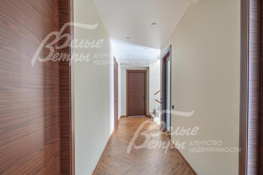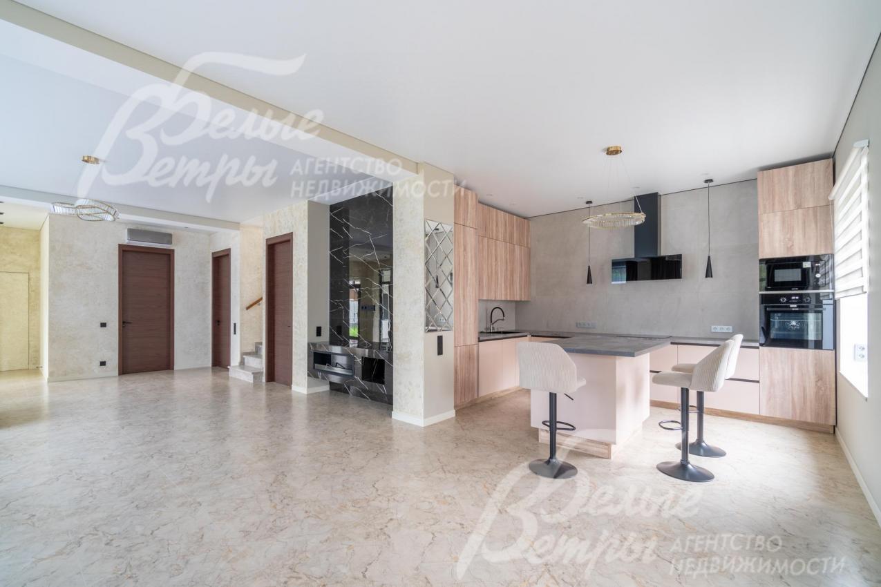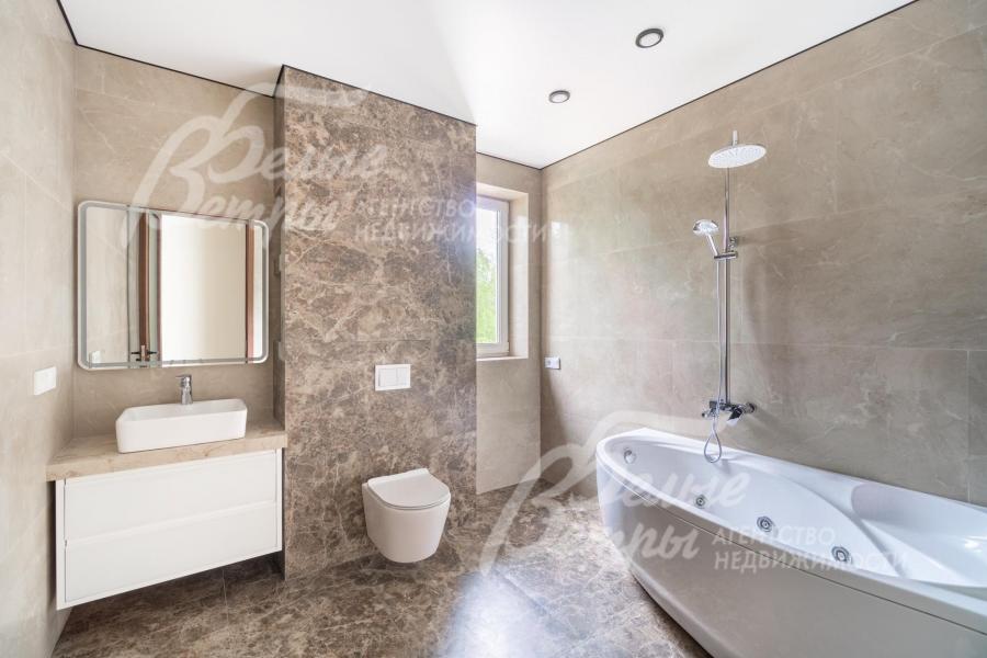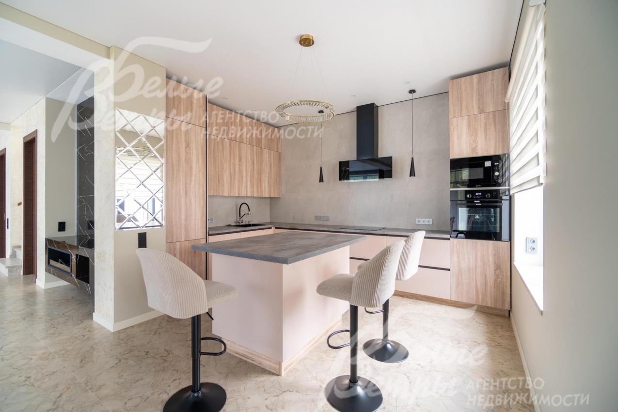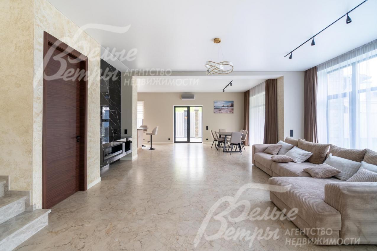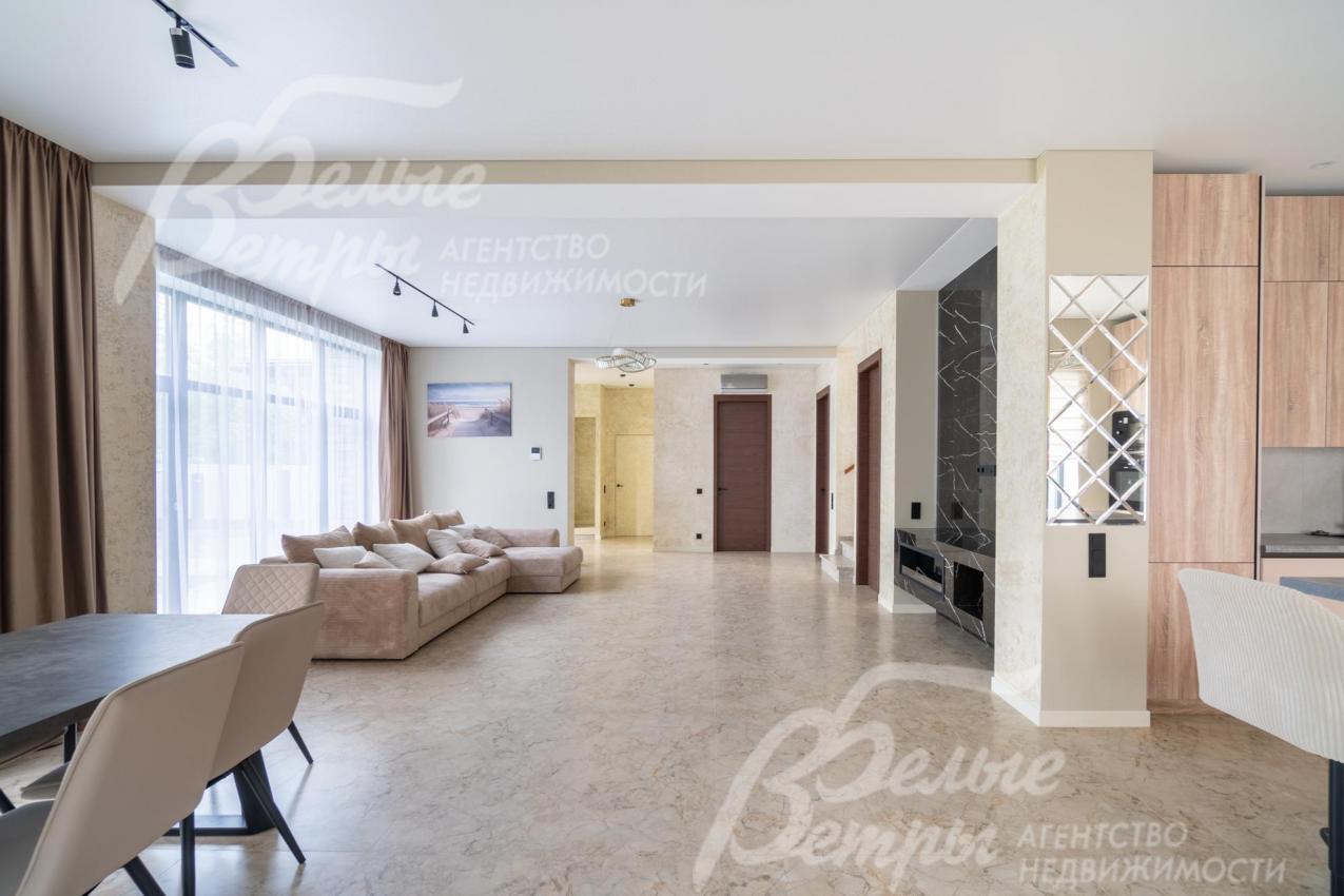 Описание внутренней отделки: интерьер выполнен в современном стиле в светло-бежевых тонах с использованием премиальных материалов и стильных дизайнерских решений. На стенах спален и общих помещений – декоративная антивандальная штукатурка в 3 слоя, имитирующая камень травертин, керамогранит (в санузлах), имитирующий слепок ригеля черного цвета, покраска стен в комнатах. На полу – крупноформатный керамогранит под мрамор на первом этаже и в санузлах на 2 этаже (под керамогранитом – тёплые водные полы), инженерная доска (кладка елочкой). Установлены натяжные потолки, двери из шпона натурального дерева высотой 2,4 м, подоконники под мрамор, трековое освещение черного цвета и светодиодная подсветка, электрика Schneider Electric черного цвета, интернет проводной и ТВ кабель для точек и до рабочих мест. На второй этаж ведёт монолитная лестница: ступени из керамогранита под мрамор с капиносом, ограждение – прозрачные перила с дубовыми поручнями. Гостиную украшает биокамин, отделанный керамогранитом