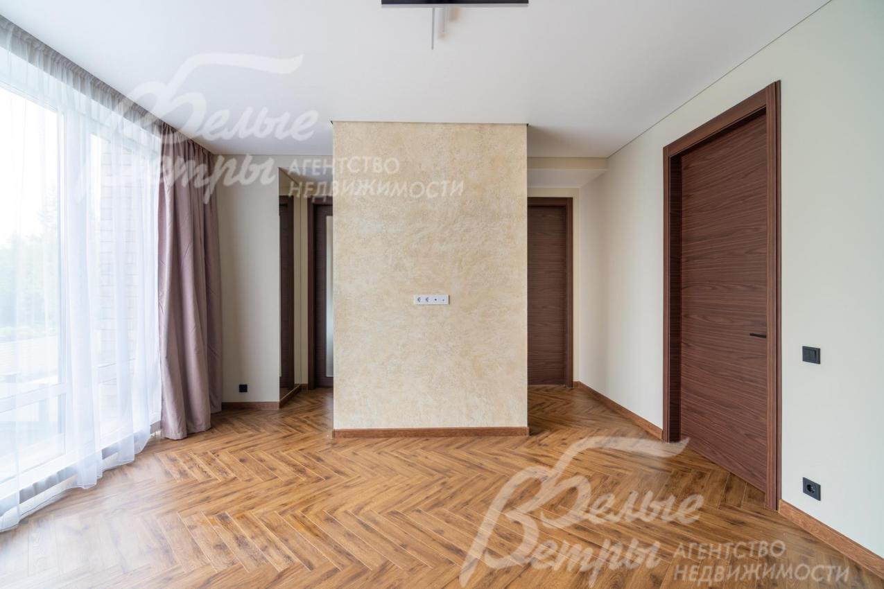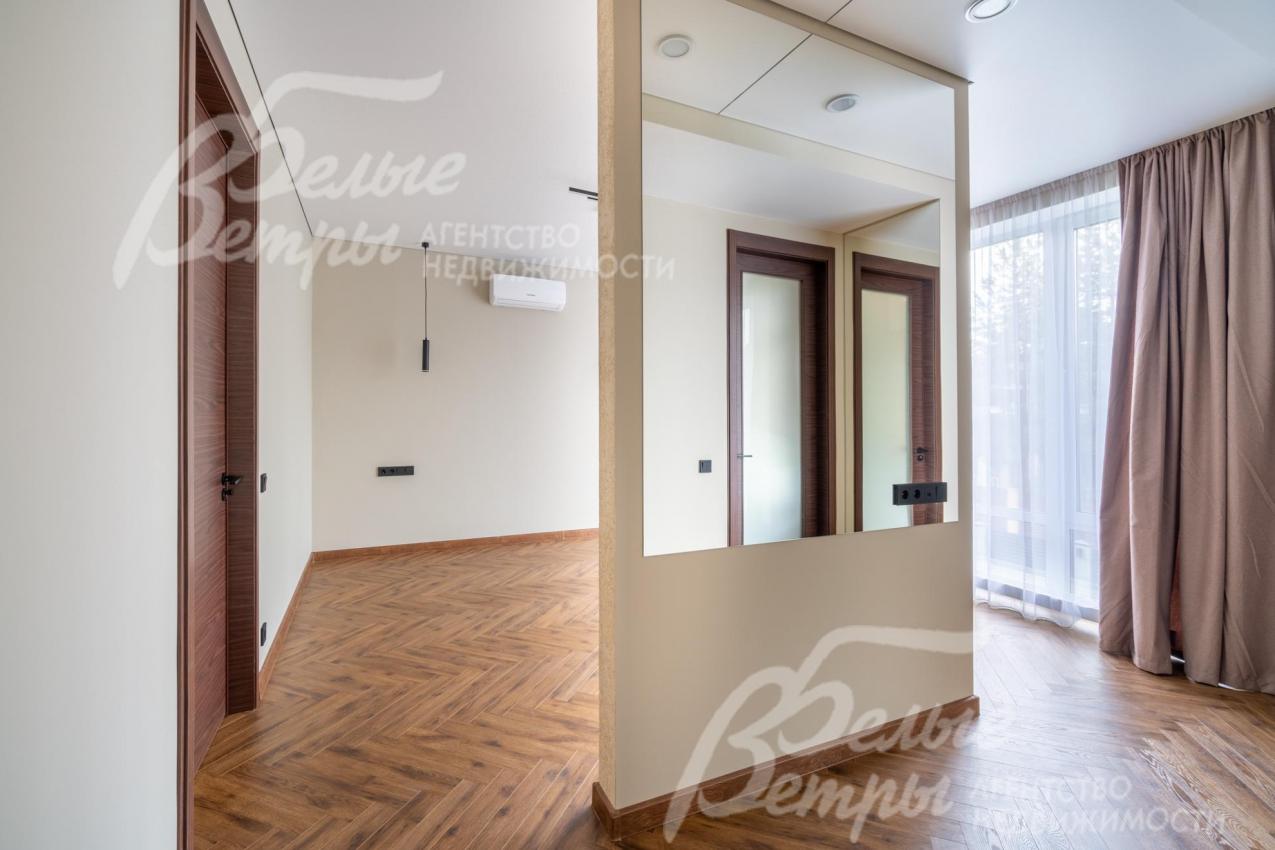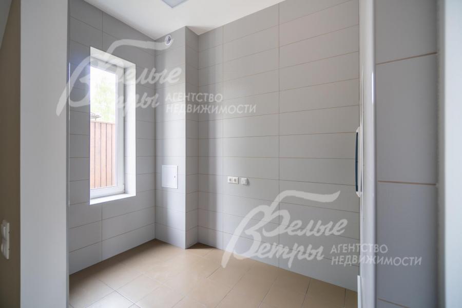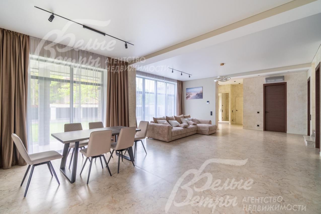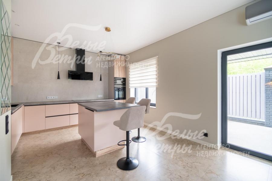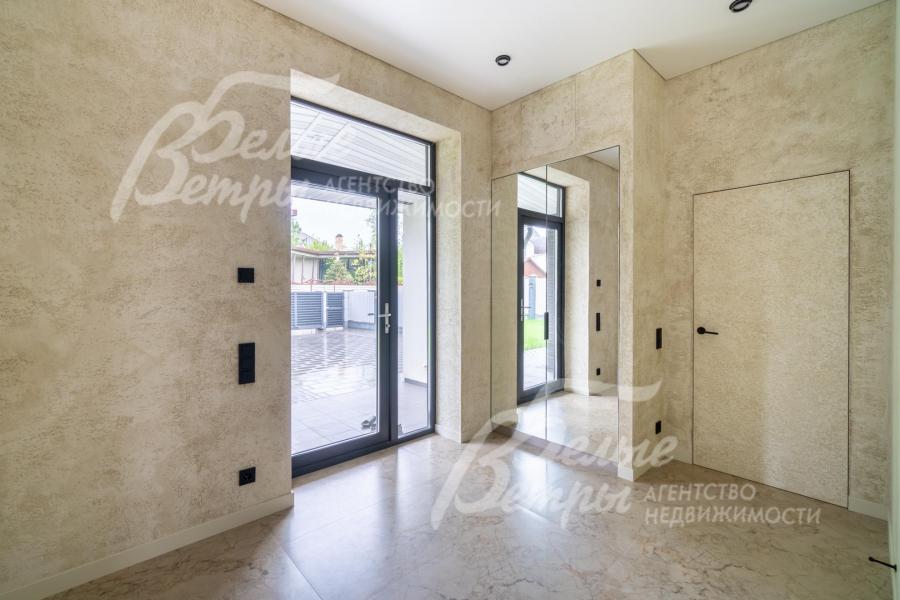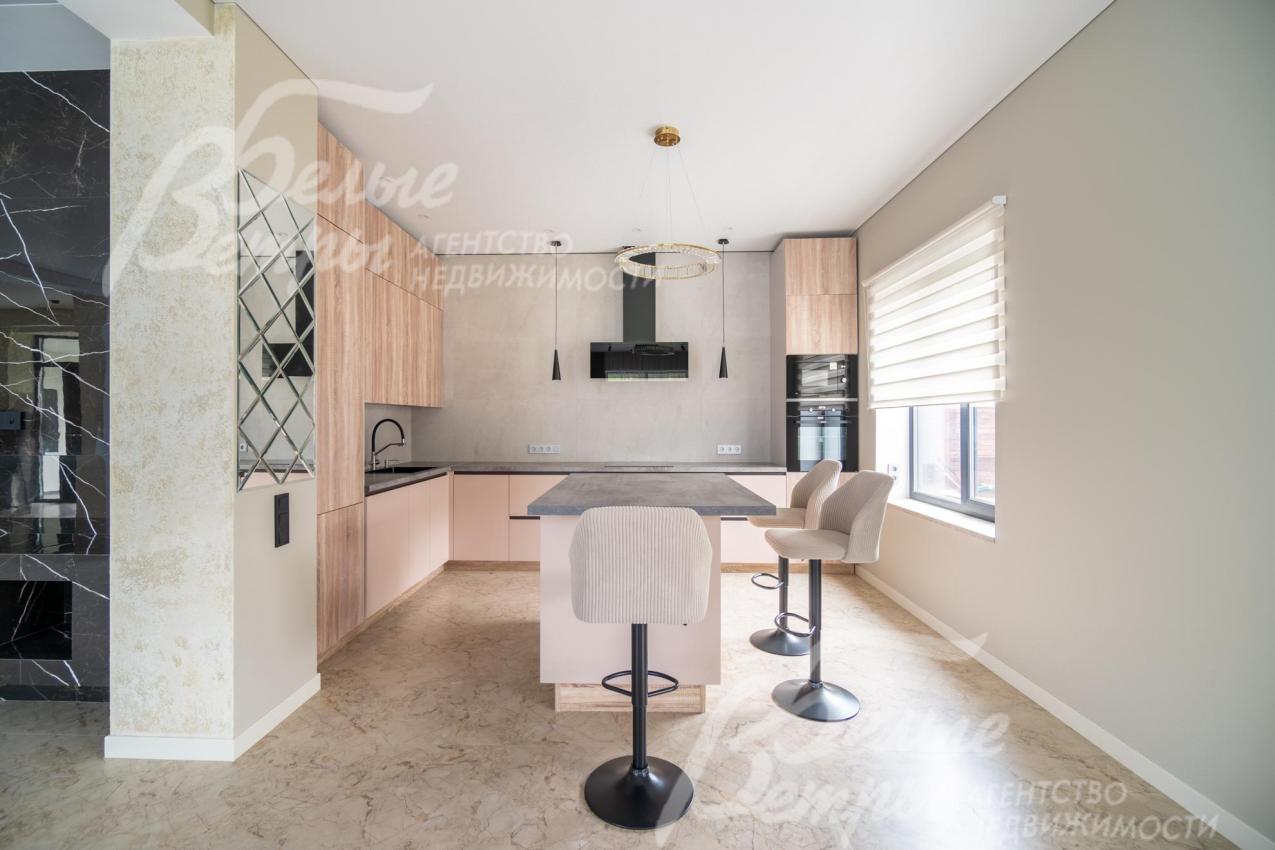 Описание внутренней отделки: интерьер выполнен в современном стиле в светло-бежевых тонах с использованием премиальных материалов и стильных дизайнерских решений. На стенах спален и общих помещений – декоративная антивандальная штукатурка в 3 слоя, имитирующая камень травертин, керамогранит (в санузлах), имитирующий слепок ригеля черного цвета, покраска стен в комнатах. На полу – крупноформатный керамогранит под мрамор на первом этаже и в санузлах на 2 этаже (под керамогранитом – тёплые водные полы), инженерная доска (кладка елочкой). Установлены натяжные потолки, двери из шпона натурального дерева высотой 2,4 м, подоконники под мрамор, трековое освещение черного цвета и светодиодная подсветка, электрика Schneider Electric черного цвета, интернет проводной и ТВ кабель для точек и до рабочих мест. На второй этаж ведёт монолитная лестница: ступени из керамогранита под мрамор с капиносом, ограждение – прозрачные перила с дубовыми поручнями. Гостиную украшает биокамин, отделанный керамогранитом