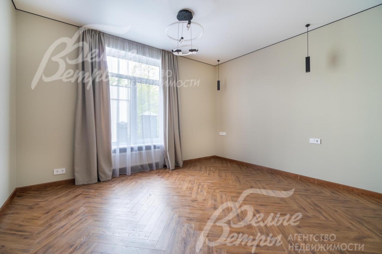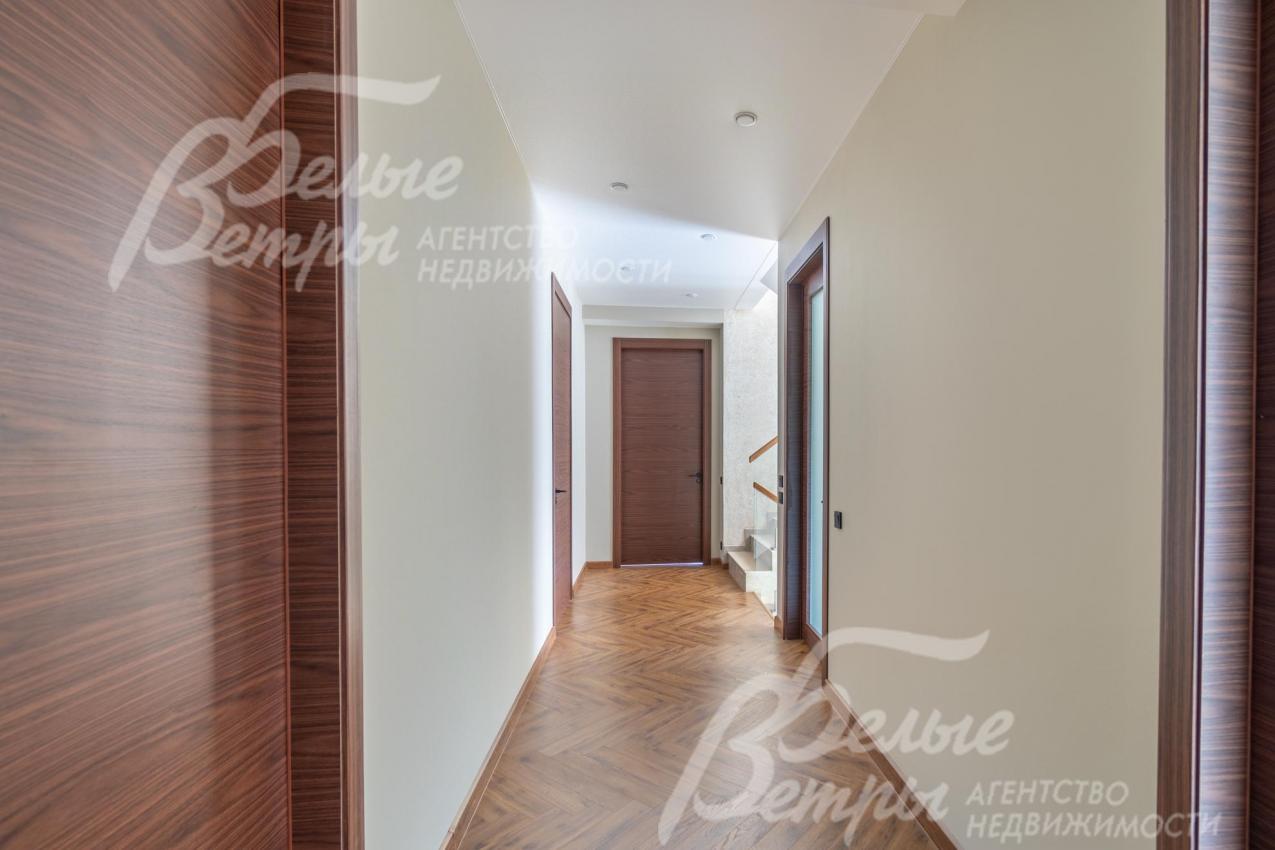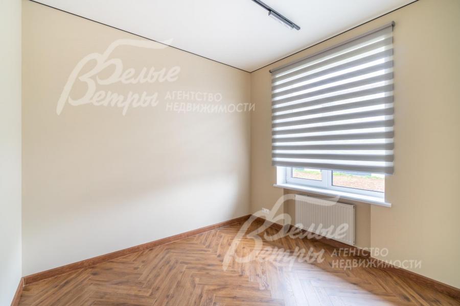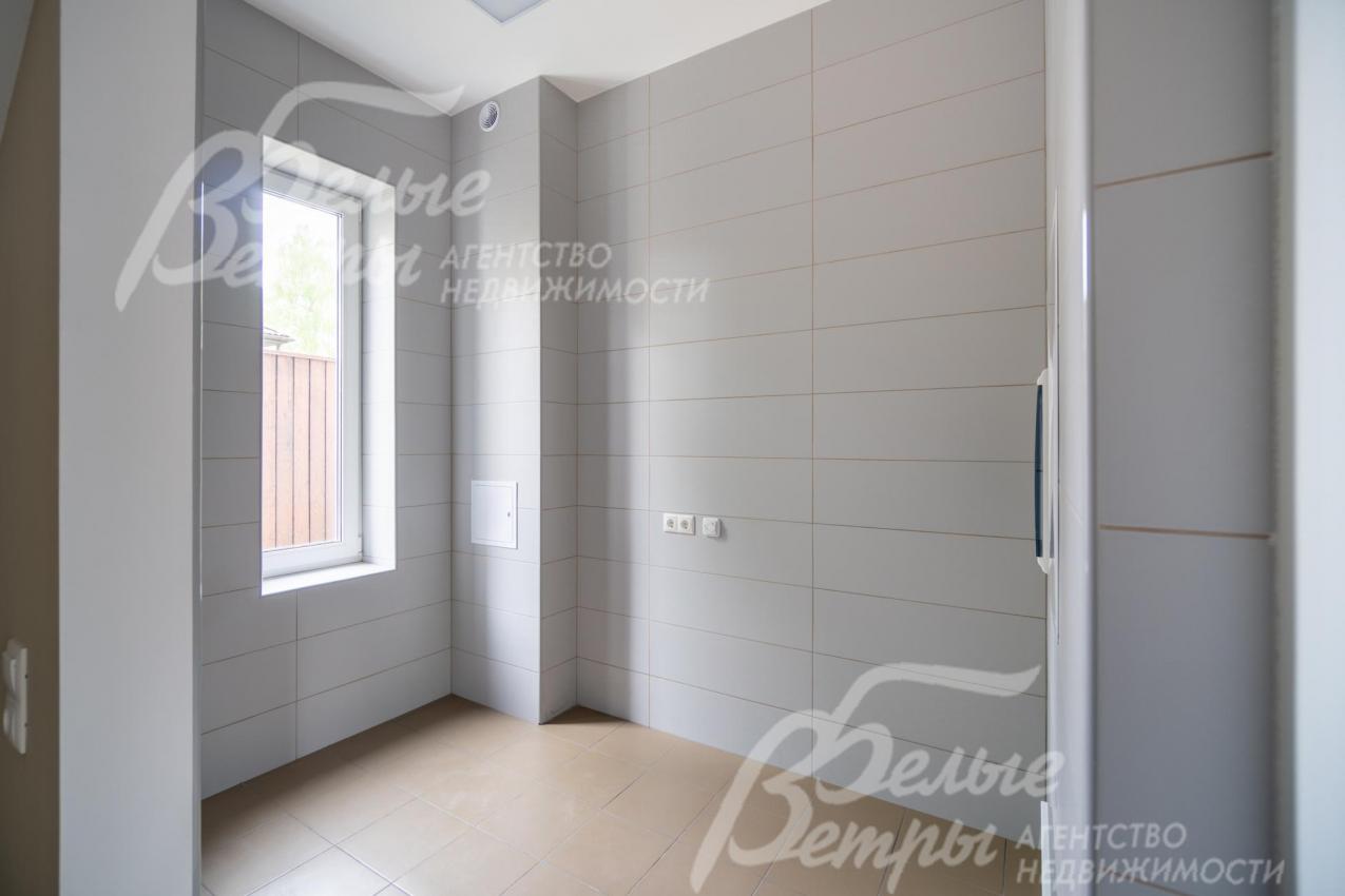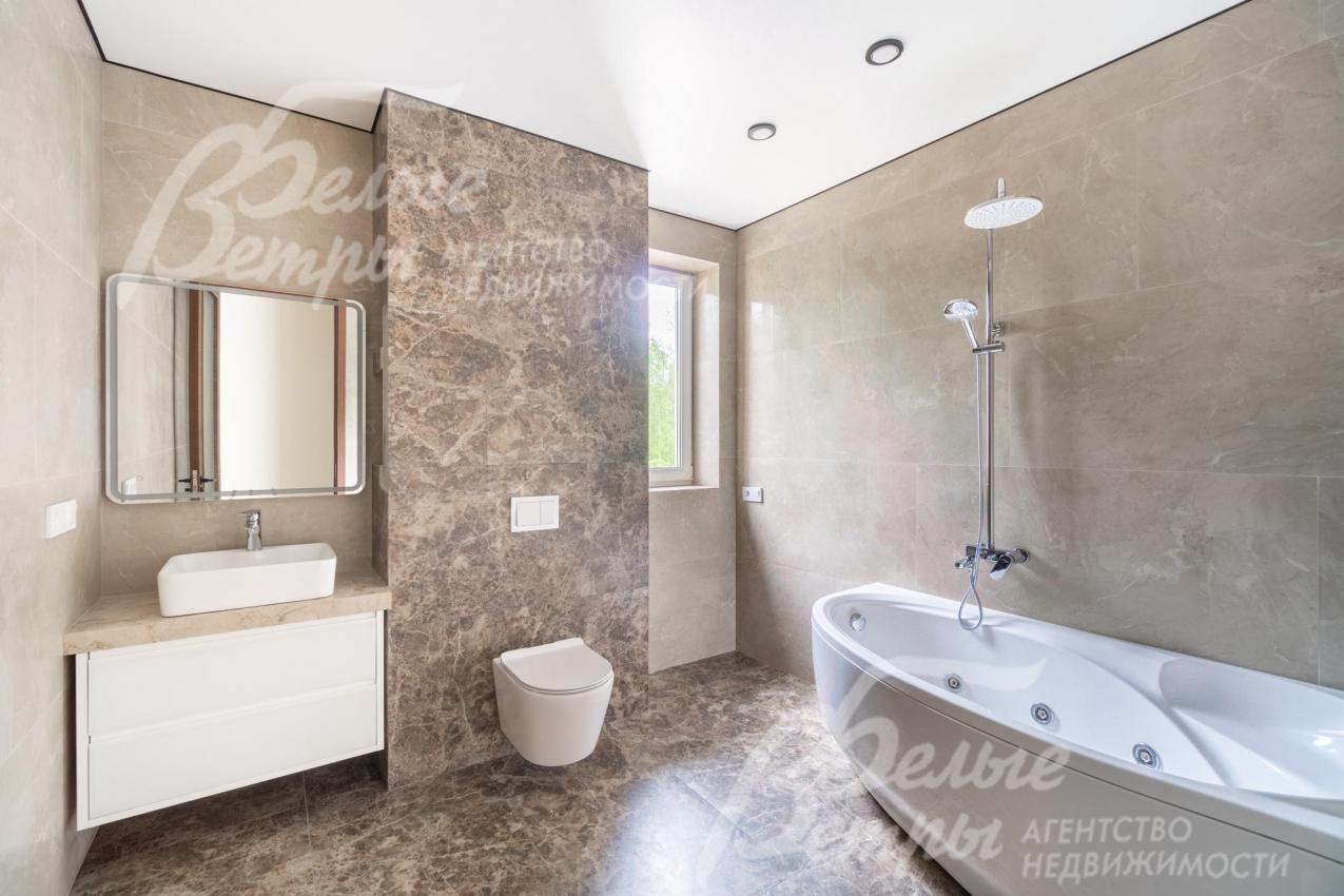 Описание внутренней отделки: интерьер выполнен в современном стиле в светло-бежевых тонах с использованием премиальных материалов и стильных дизайнерских решений. На стенах спален и общих помещений – декоративная антивандальная штукатурка в 3 слоя, имитирующая камень травертин, керамогранит (в санузлах), имитирующий слепок ригеля черного цвета, покраска стен в комнатах. На полу – крупноформатный керамогранит под мрамор на первом этаже и в санузлах на 2 этаже (под керамогранитом – тёплые водные полы), инженерная доска (кладка елочкой). Установлены натяжные потолки, двери из шпона натурального дерева высотой 2,4 м, подоконники под мрамор, трековое освещение черного цвета и светодиодная подсветка, электрика Schneider Electric черного цвета, интернет проводной и ТВ кабель для точек и до рабочих мест. На второй этаж ведёт монолитная лестница: ступени из керамогранита под мрамор с капиносом, ограждение – прозрачные перила с дубовыми поручнями. Гостиную украшает биокамин, отделанный керамогранитом