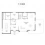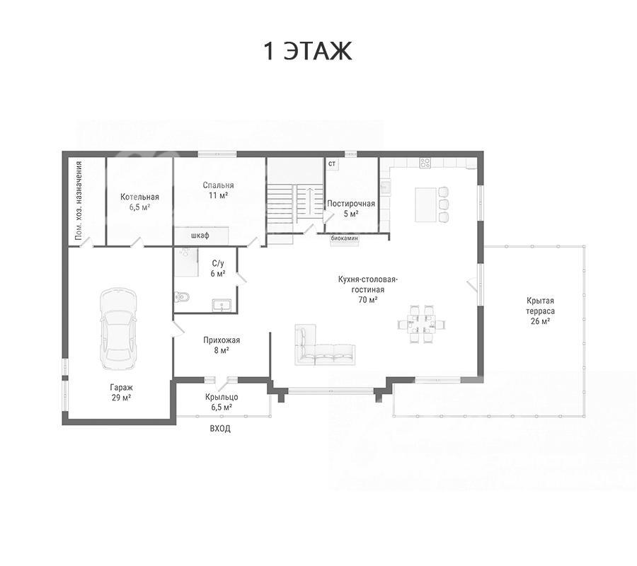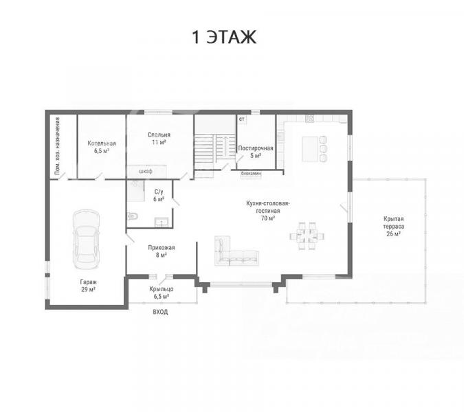 1-ый этаж: крыльцо 6,5 кв.м, прихожая 8 кв.м, кухня-столовая-гостиная 70 кв.м с выходов на террасу 26 кв.м, спальня 11 кв.м, санузел с душевой 6 кв.м, постирочная 5 кв.м, гараж 29 кв.м, котельная 6,5 кв.м, хозяйственное помещение