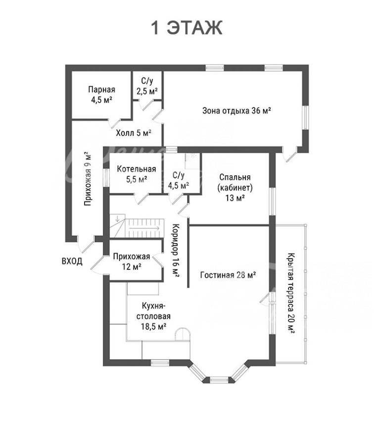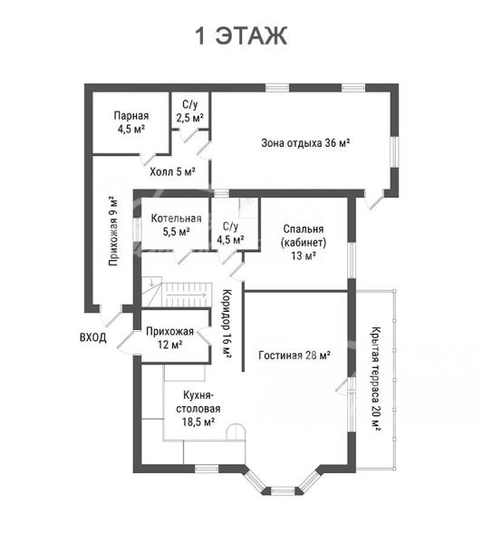 1-ый этаж: прихожая 12 кв.м, коридор 16 кв.м, кухня-столовая 18,5 кв.м, гостиная 28 кв.м с выходом на крытую террасу 20 кв.м, спальня (кабинет) 13 кв.м, санузел с душем 4,5 кв.м, котельная 5,5 кв.м;