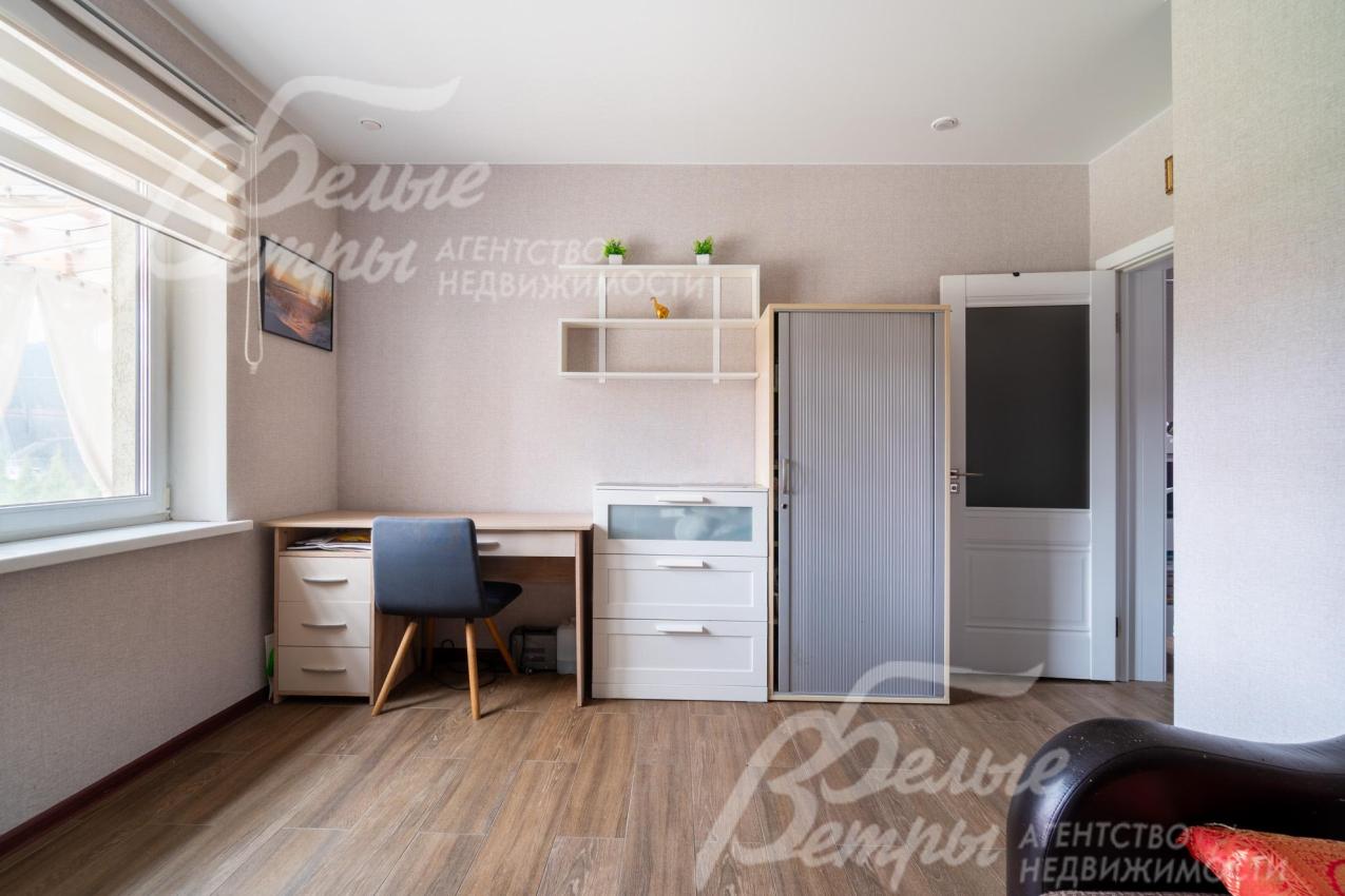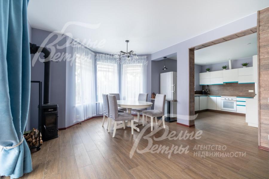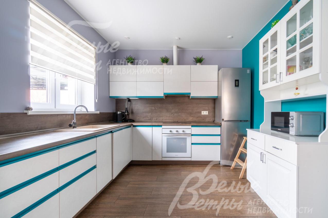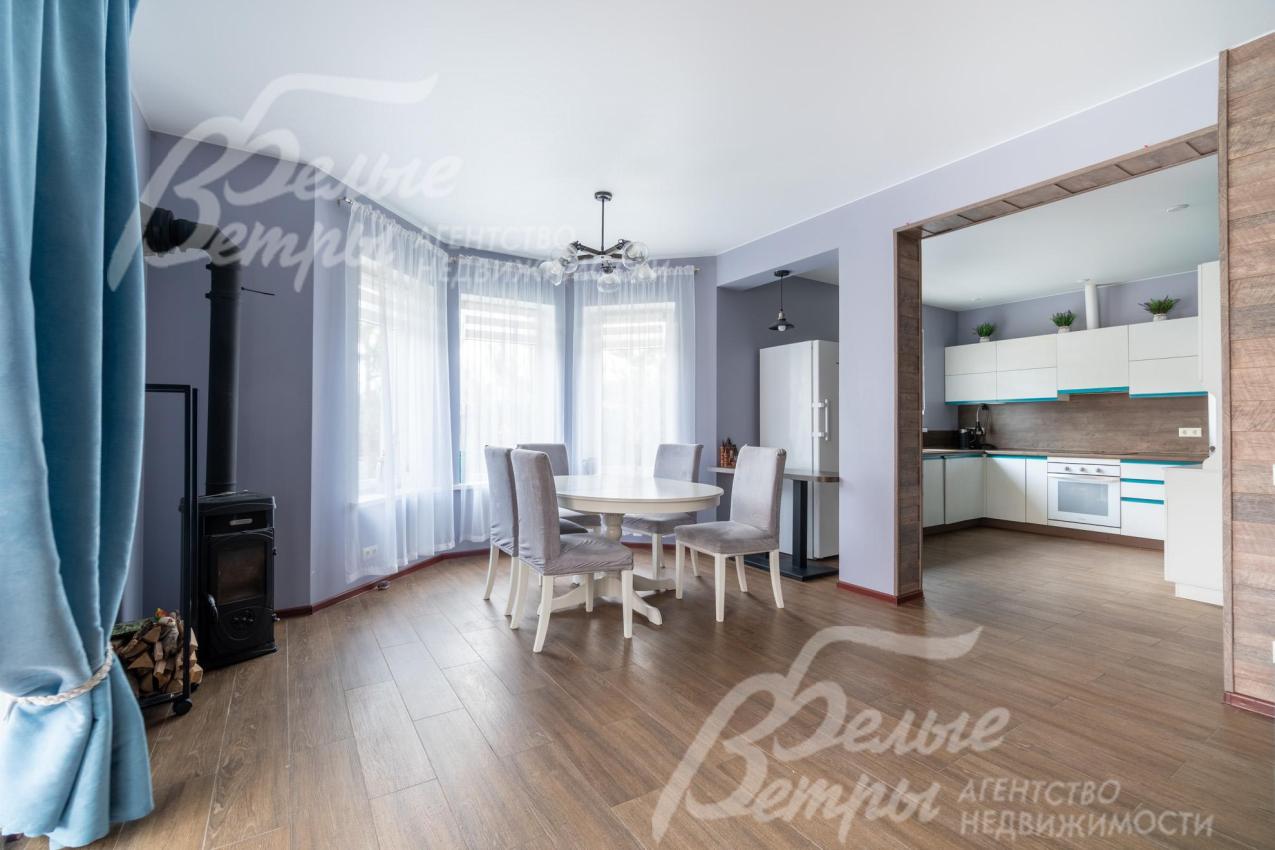 Описание внутренней отделки: в доме выполнена современная отделка уровня бизнес-класса. Стены на первом этаже окрашены краской Tikkurila Eurocolor, на втором этаже поклеены обои. Пол полностью выложен керамогранитом с интегрированной системой тёплого пола с водяным подогревом. Стены санузлов и части других помещений облицованы плиткой до потолка. Потолки натяжные, с системой встроенных светильников. В гостиной — панорамное остекление от пола. Входная группа — с дорогостоящей дверью с элементами стекла и художественной ковки. Межкомнатные двери — ProfilDoors из массива дерева, шпонированные и окрашенные в белый цвет. Высокие плинтусы выполнены в тон дверям, подоконники ламинированы в цвет оконных рам. Лестница на второй этаж — монолитная с отделкой ступеней керамогранитом, перила выполнены из художественной ковки