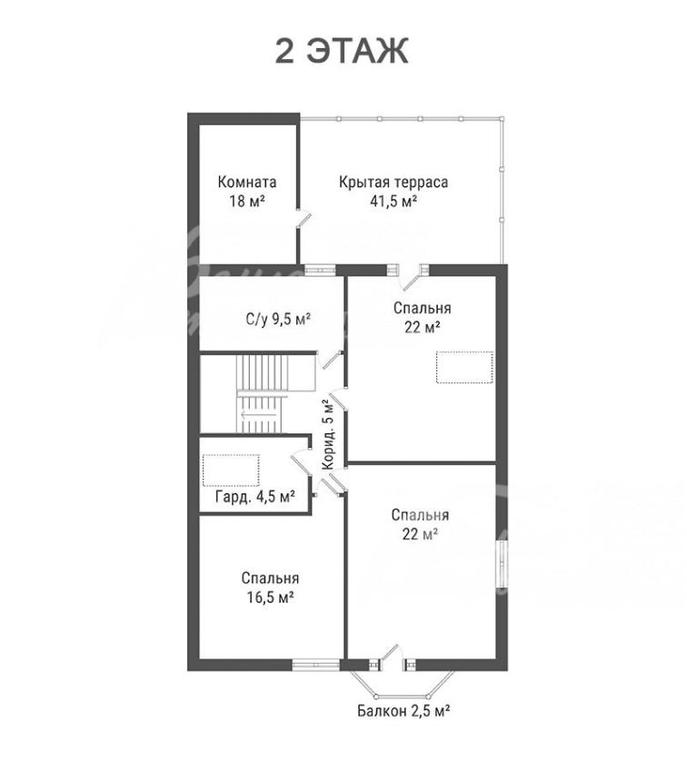 2-ой этаж: коридор 5 кв.м, спальня 22 кв.м с выходом на крытую террасу 41,5 кв.м и с выходом в пристройку, спальня 22 кв.м с выходом на балкон 2,5 кв.м, спальня 16,5 кв.м, гардеробная 4,5 кв.м, санузел с ванной 9,5 кв.м;