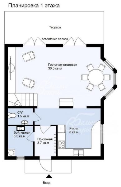 1-ый этаж: прихожая 4 кв.м, техническое помещение 5 кв.м, гостевой санузел 2 кв.м, кухня 8 кв.м, гостиная 31 кв.м.