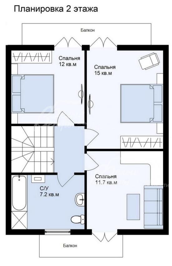 2-ой этаж: коридор 3 кв.м, санузел 7 кв.м с ванной и душевой, спальня 15 кв.м, спальня 12 кв.м, cпальня 12 кв.м.