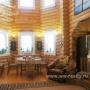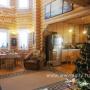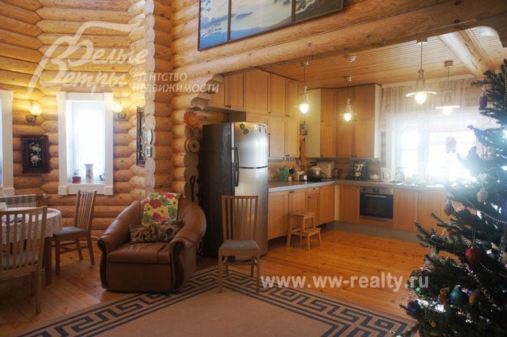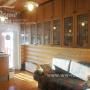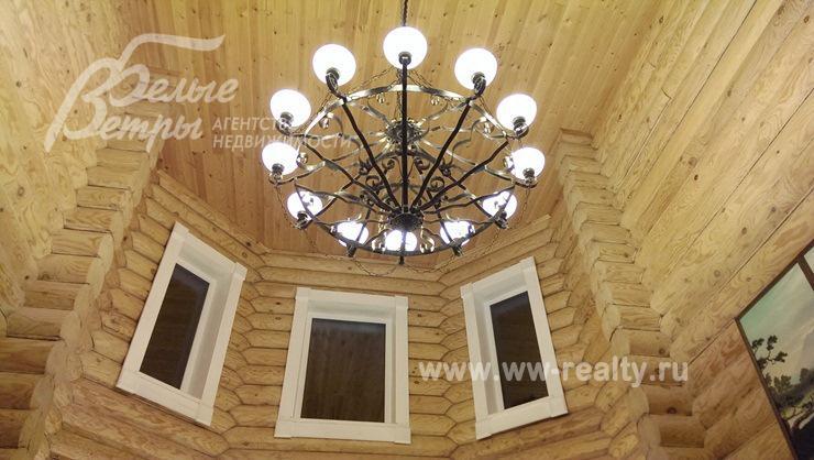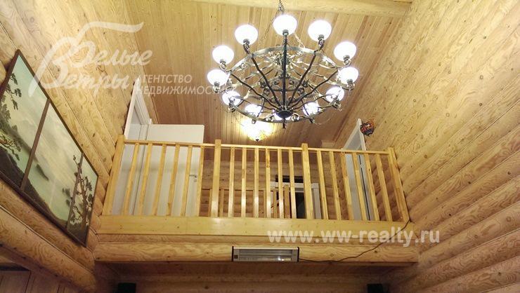 Описание внутренней отделки: Внутренние стены - бревно, покрытое защитной лазурью с легким матовым оттенком. Пол - деревянная доска сосны, плитка с водяным подогревом. В санузлах стены отделаны мозаичной плиткой. Потолки отделаны деревянной доской, окрашены защитным составом. Двери финские шпонированные, подоконники деревянные. Лестница деревянная (сосна) высокого качества.