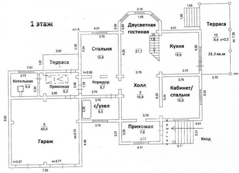 1-ый этаж: прихожая 7.5 кв.м, холл 17 кв.м, гостиная со вторым светом и эркером 23.5 кв.м, кухня-столовая 16.5 кв.м с выходом на террасу 21 кв.м, коридор 6 кв.м, спальня 15 кв.м, с/узел 8 кв.м, кабинет 16 кв.м, бойлерная 16.5 кв.м, гараж 45 кв.м