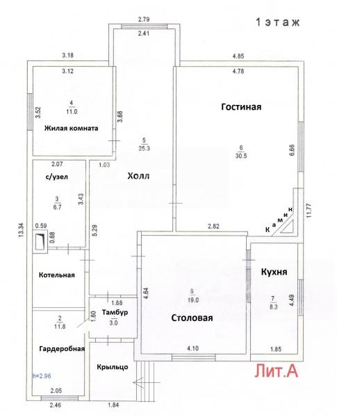 1-ый этаж: крыльцо, тамбур 3 кв.м, гардеробная 5 кв.м, с/узел 7 кв.м, холл 25 кв.м, каминный зал 30.5 кв.м, кухня 8 кв.м, столовая 19 кв.м, жилая комната 11 кв.м, котельная 7 кв.м