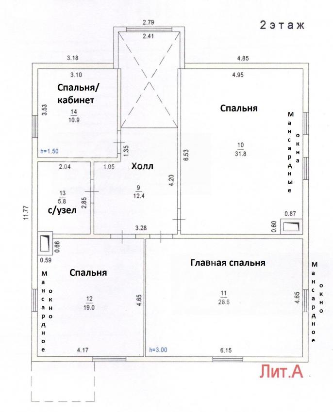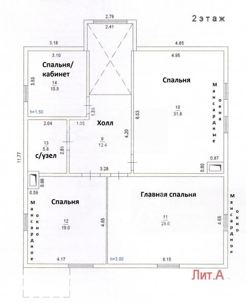 2-ой этаж: холл 12 кв.м, Главная спальня 32 кв.м (с двумя мансардными окнами), спальни 28.6 кв.м и 19 кв.м, с/узел 6 кв.м с мансардным окном, кабинет/спальня 11 кв.м