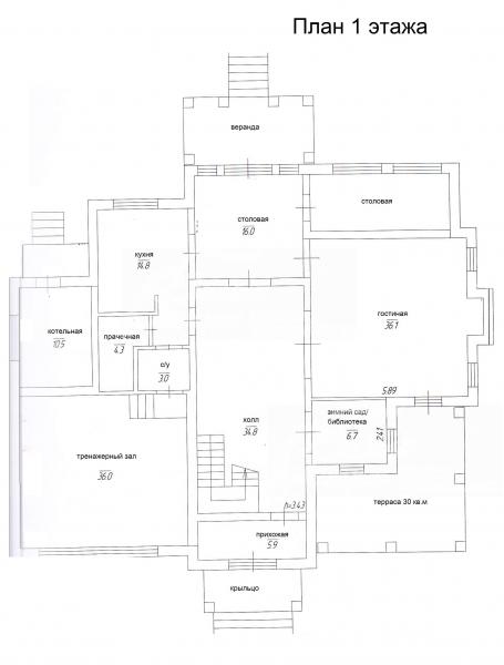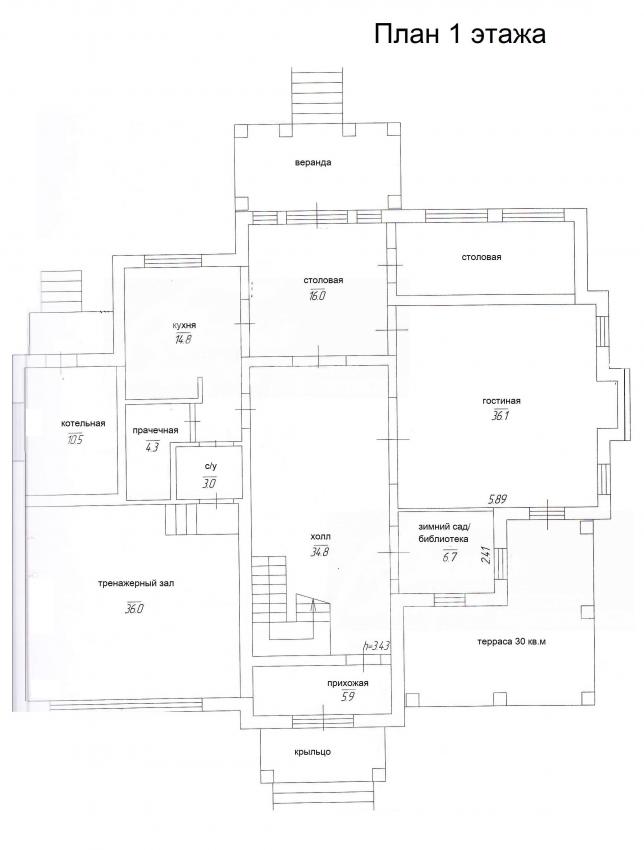 1-ый этаж: крыльцо, прихожая 5.9 кв.м, холл 34.8 кв.м, библиотека 6.7 кв.м, терраса 30 кв.м, гостиная со вторым светом 36.1 кв.м, столовая 16 кв.м, веранда, столовая 16+11.3 кв.м, кухня 14.8 кв.м, постирочная 4.3 кв.м, с/у 3 кв.м, котельная 10.5 кв.м, тренажерный зал 36 кв.м