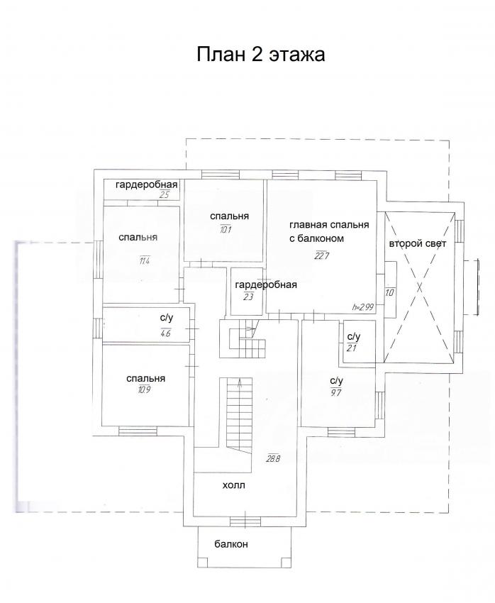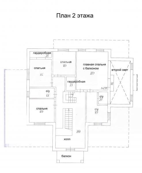2-ой этаж: холл 28.8 кв.м с выходом на балкон 1.7 кв.м, главная спальня 22.7 кв.м с гардеробной 2.3 кв.м, балконом и с с/у 9.7 кв.м, с/у 2.1 кв.м, спальня 11.4 кв.м, спальня 10.1 кв.м с гардеробной 2.5 кв.м спальня 10.9 кв.м, с/у 4.6 кв.м