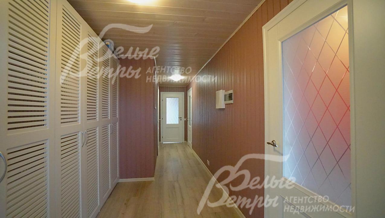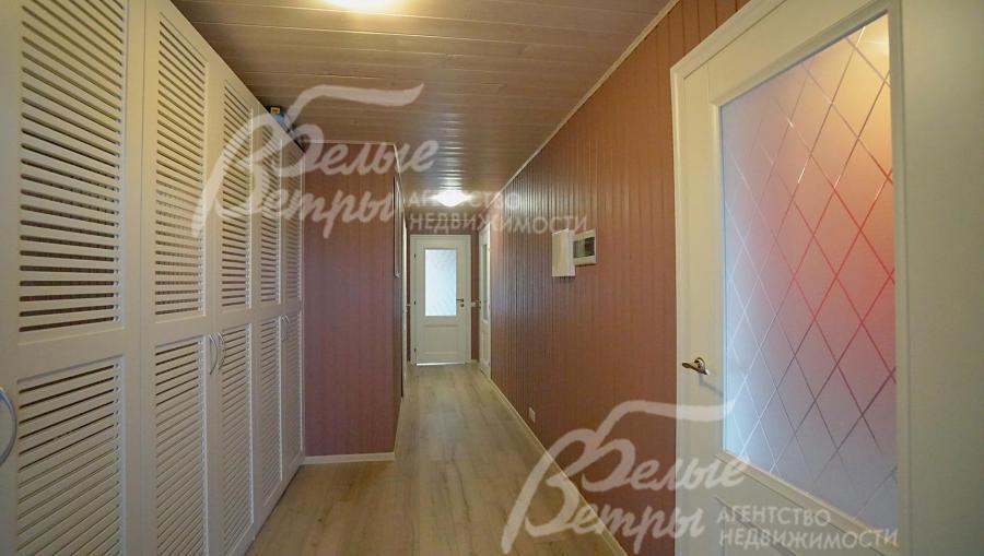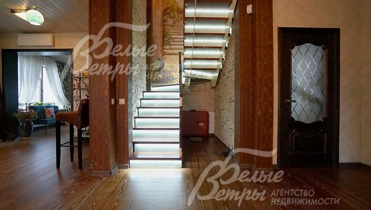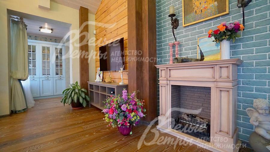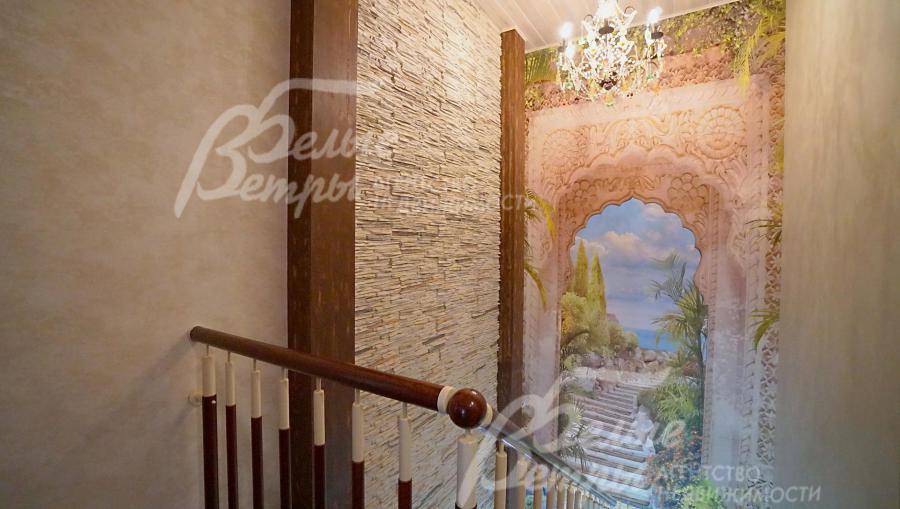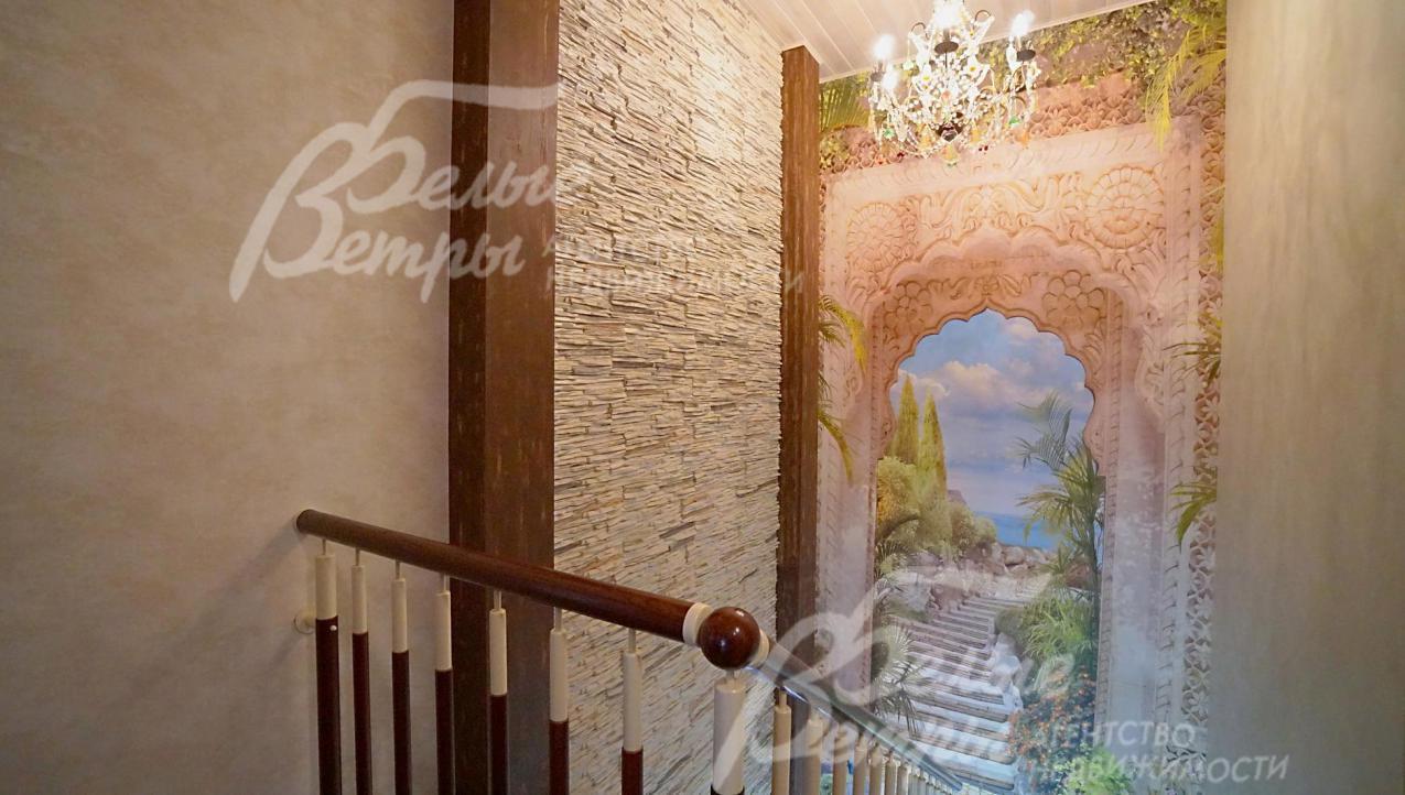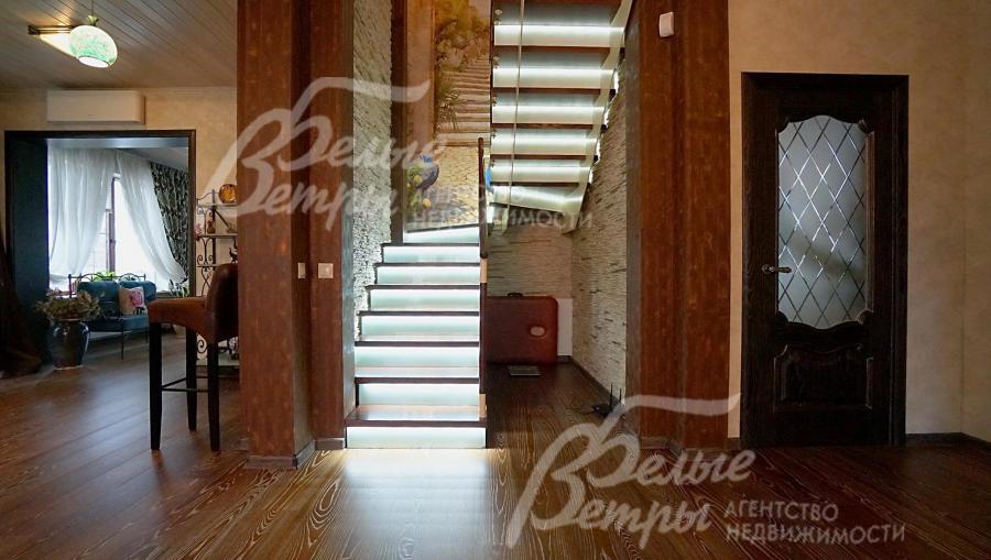 Описание внутренней отделки: деревянный дом отделан изнутри как каменный ( дорогие обои и плитка на ГКЛ). Стены: клееный брус, евровагонка сосна + лиственница, декоративная плитка, обои, фреска. На полу паркетная доска + плитка ( тёплые водяные полы ). Лестничный марш на металлокаркасе , ступени отделаны деревом (бук крашенный), светодиодная подсветка.