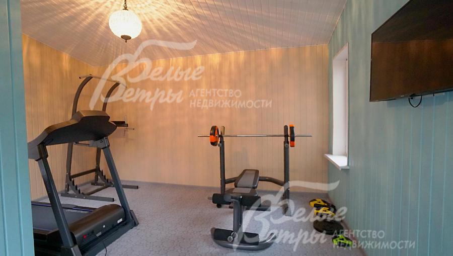 - Терраса с фитобочкой (растапливается дровами) . Зимний спортзал - 18кв.м. Отделка - евровагонка (сосна) , отапливается электричеством.
