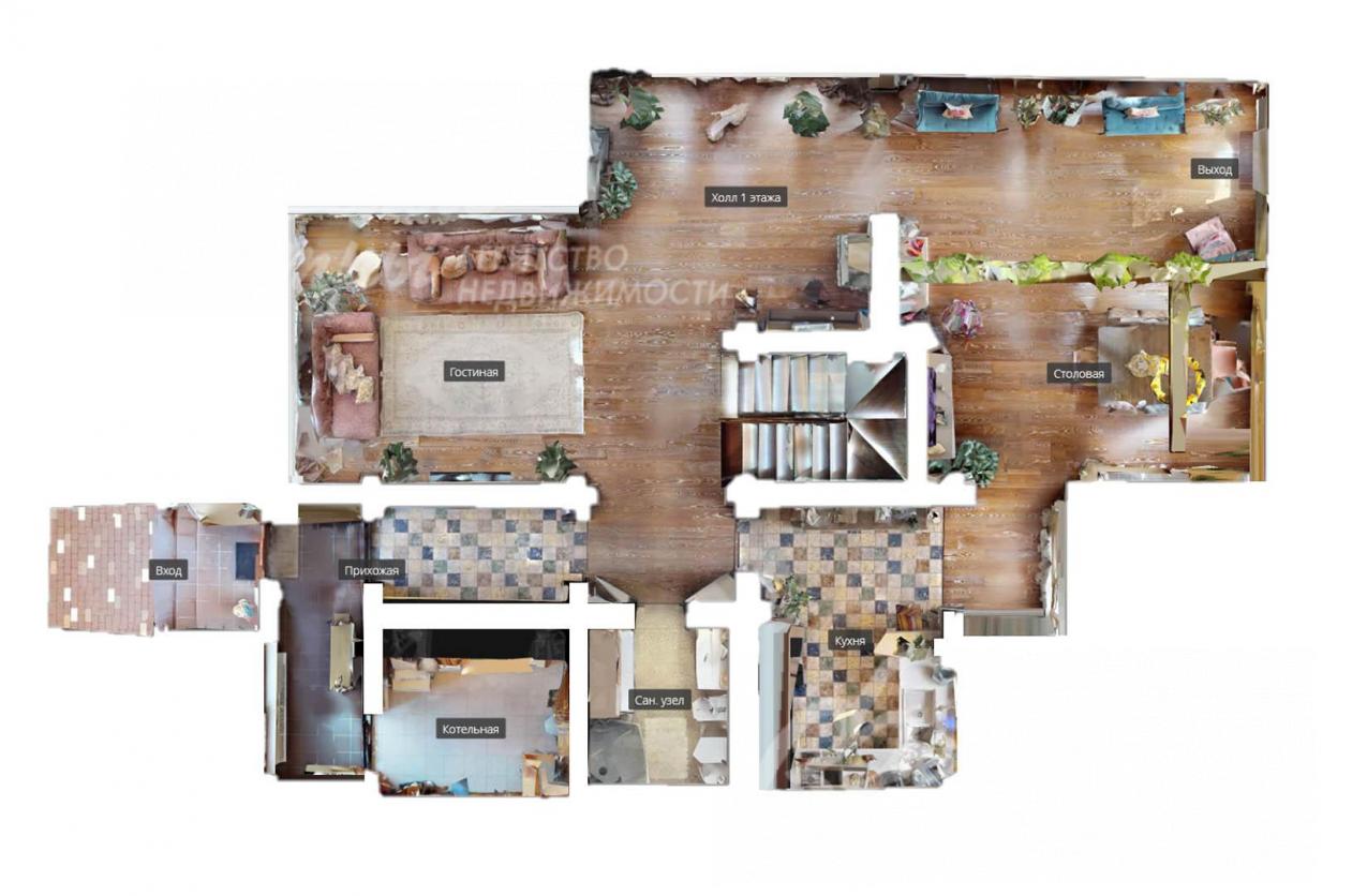 1-ый этаж: крытая терраса, котельная, прихожая, котельная, холл, с/у, гостиная, кухня, столовая, гараж с мастерской, генератором и многоступенчатой очисткой воды, отдельный выход во двор