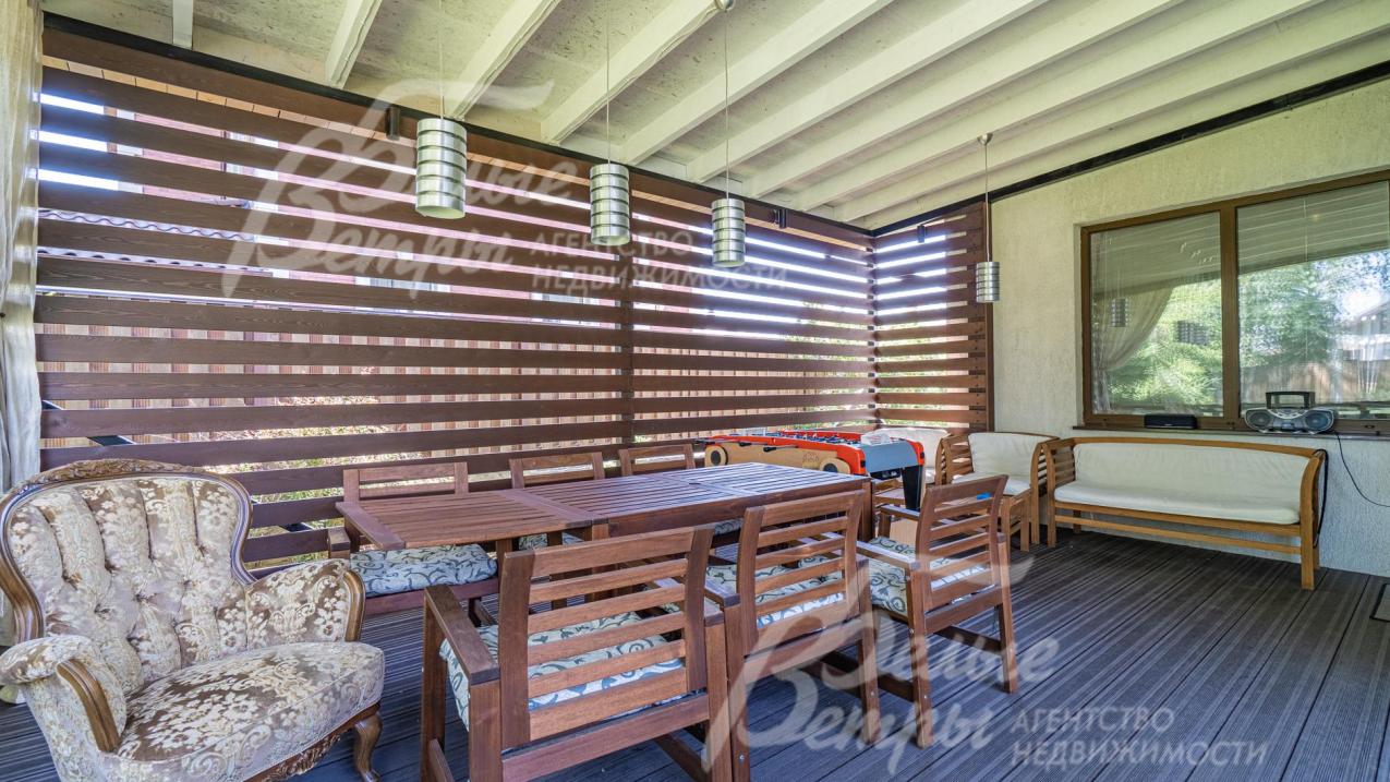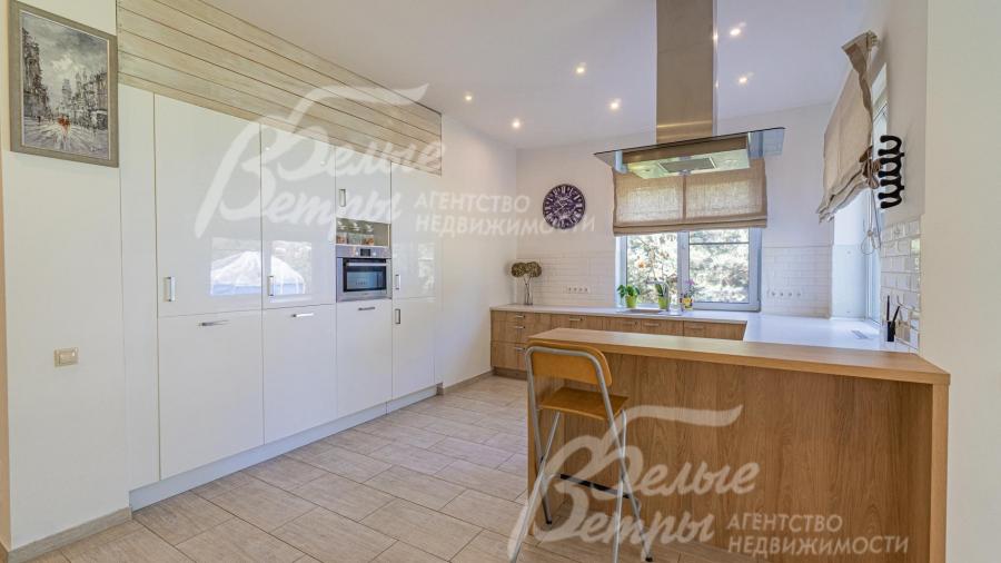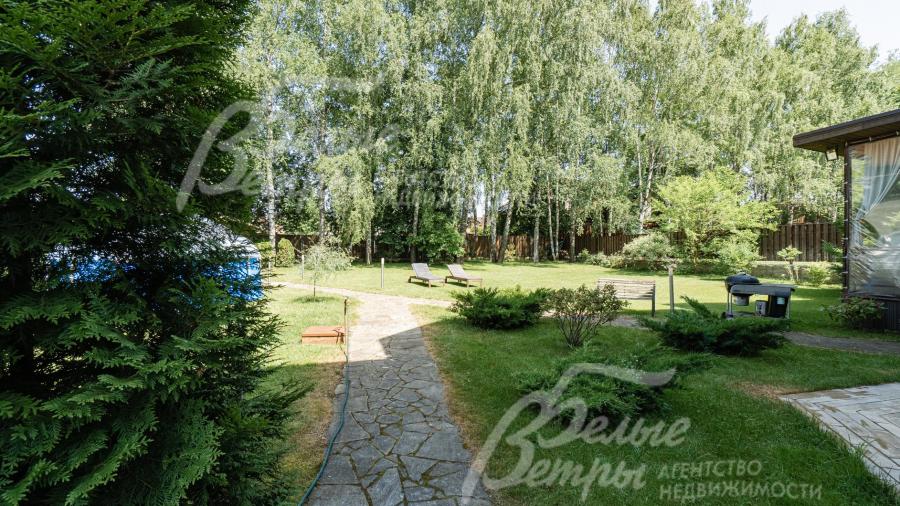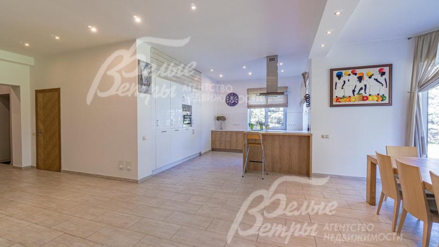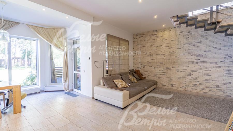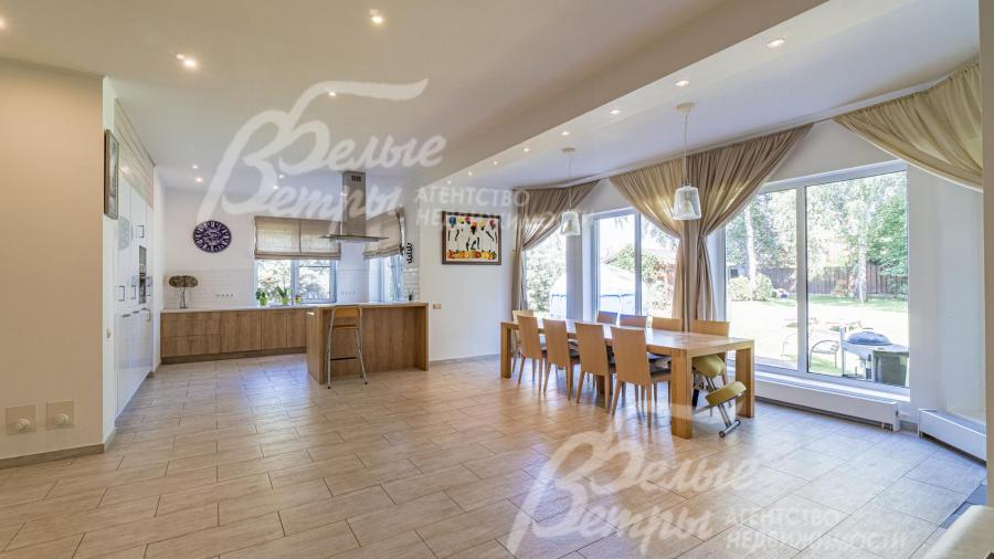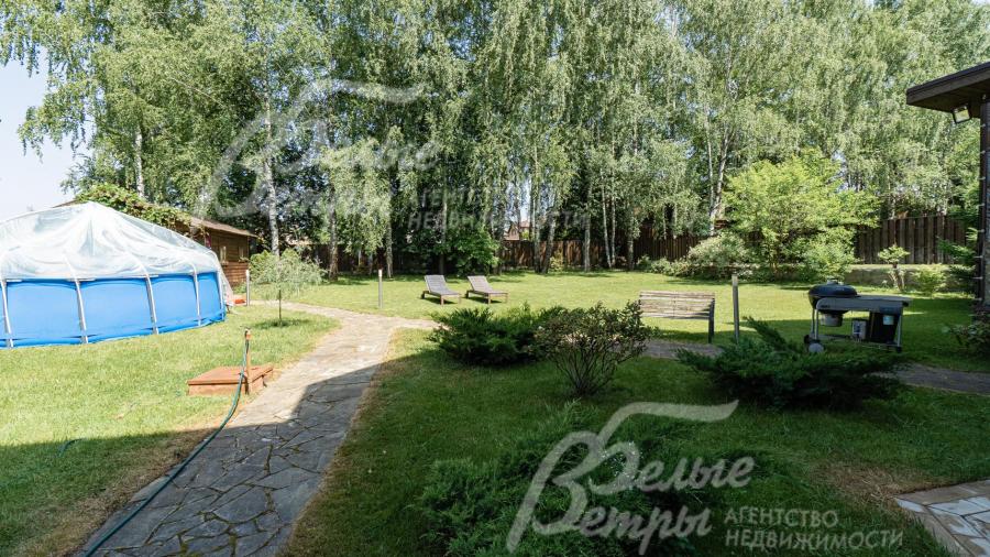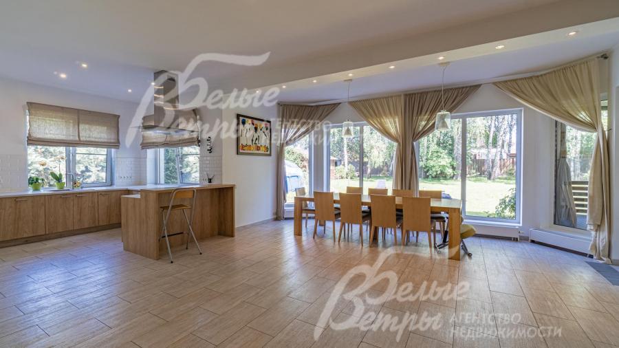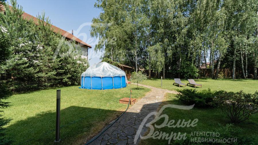 Дом современной архитектуры (просторные помещения, высокие потолки, большие окна), под ключ, с отдельностоящей баней и уличным бассейном, в охраняемом коттеджном поселке с отличной транспортной доступностью. Удачная планировка: 4 спальни, просторная гостиная, много гардеробных и мест для хранения, большая крытая терраса. Отличное инженерное обеспечение. Привлекательный ландшафт участка - собственная березовая аллея, множество других взрослых деревьер и кустарников, автополив.