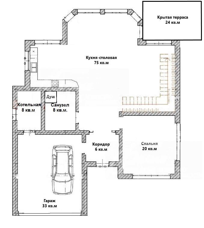1-ый этаж: коридор 6 кв.м, гараж 33 кв.м, санузел 8 кв.м, кухня-столовая 75 кв.м с выходом на крытую террасу 24 кв.м, спальня 20 кв.м, котельная 8 кв.м.