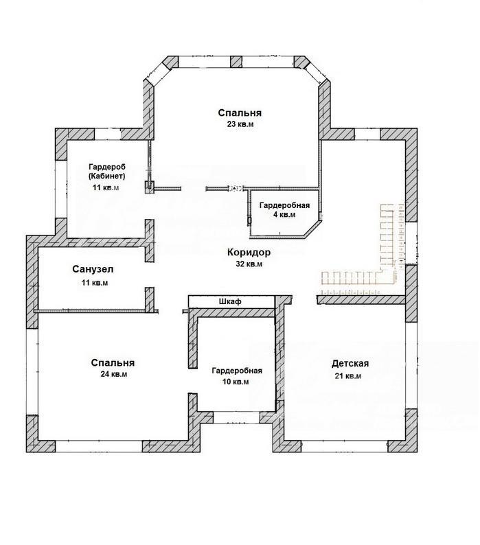 2-ой этаж: коридор 32 кв.м, спальня 21 кв.м, гардеробная 10 кв.м, спальня 24 кв.м, санузел 11 кв.м, спальня 23 кв.м, гардеробная 4 кв.м, жилая 11 кв.м.