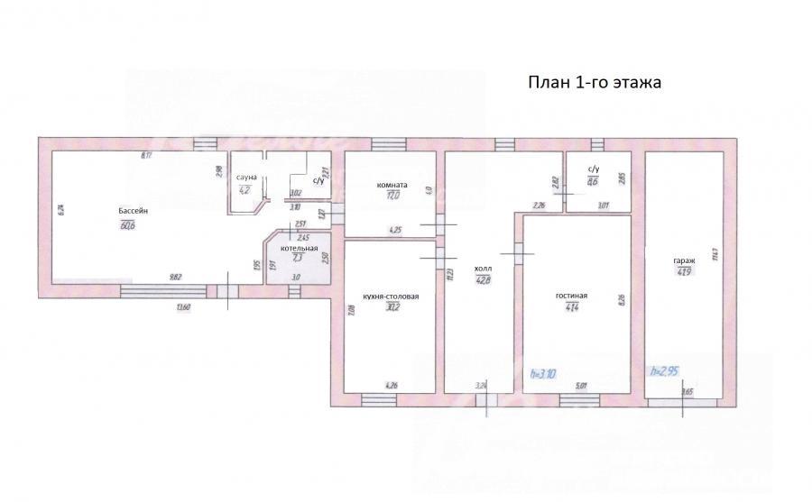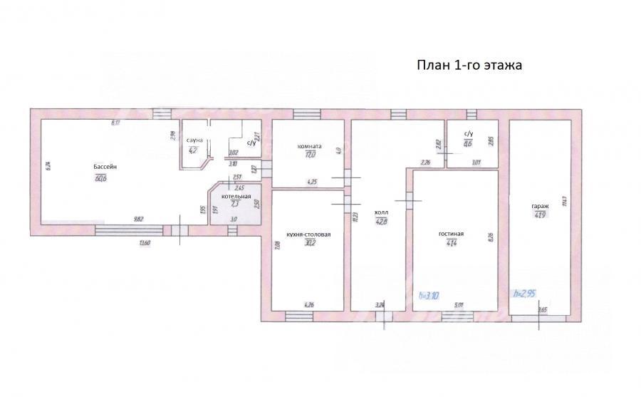 1-ый этаж: гараж 42 кв.м, холл-коридор 43 кв.м, гостиная 41 кв.м, с/узел 9 кв.м, кухня-столовая 30 кв.м, проходная комната 17 кв.м; бассейн 60 кв.м (чаша бассейна 6х2,5 м, глубина 1.2 м), сауна, с/узел, бойлерная