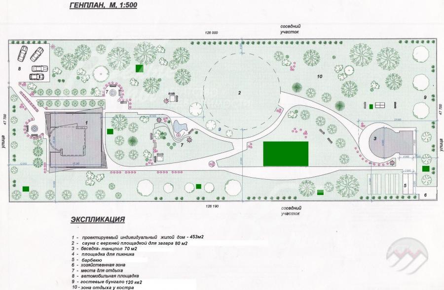 Общая площадь строений: 716 м2 (в т.ч.: гостевой дом 120кв.м, баня 80кв.м, дискобар 63кв.м. На выбор два проекта основного дома)