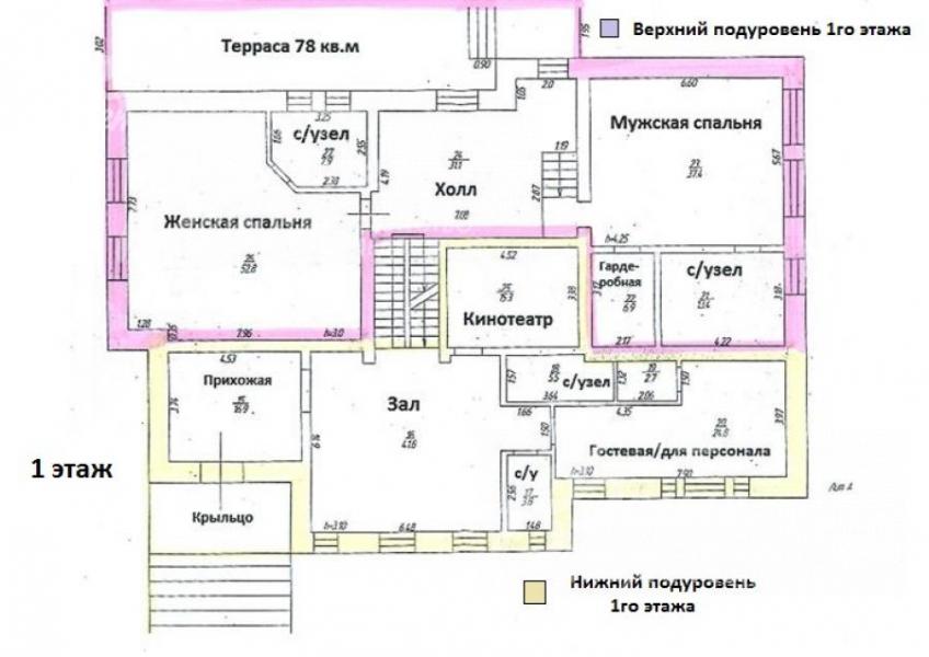 1-ый этаж: - Нижний подуровень: крыльцо, прихожая 17 кв.м, зал 42 кв.м, кинотеатр 15 кв.м, с/узел 4 кв.м, гостевая комната/для персонала 25 кв.м, с/узел 5.5 кв.м, кладовая 3 кв.м
