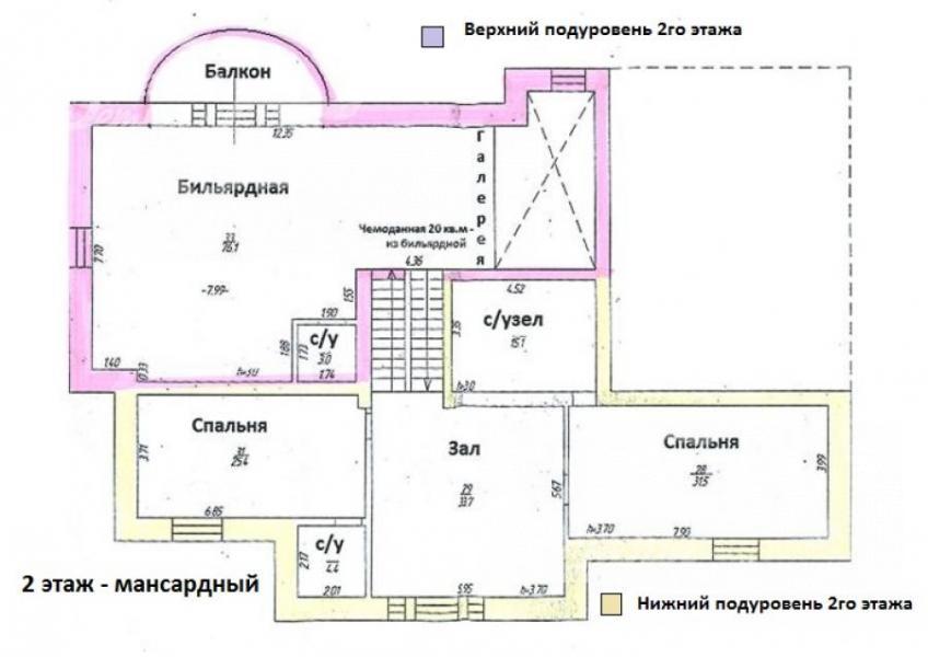 - Верхний подуровень: галерея, бильярдная 76 кв.м с круглым балконом, с/узел, чемоданная 20 кв.м (из бильярдной)