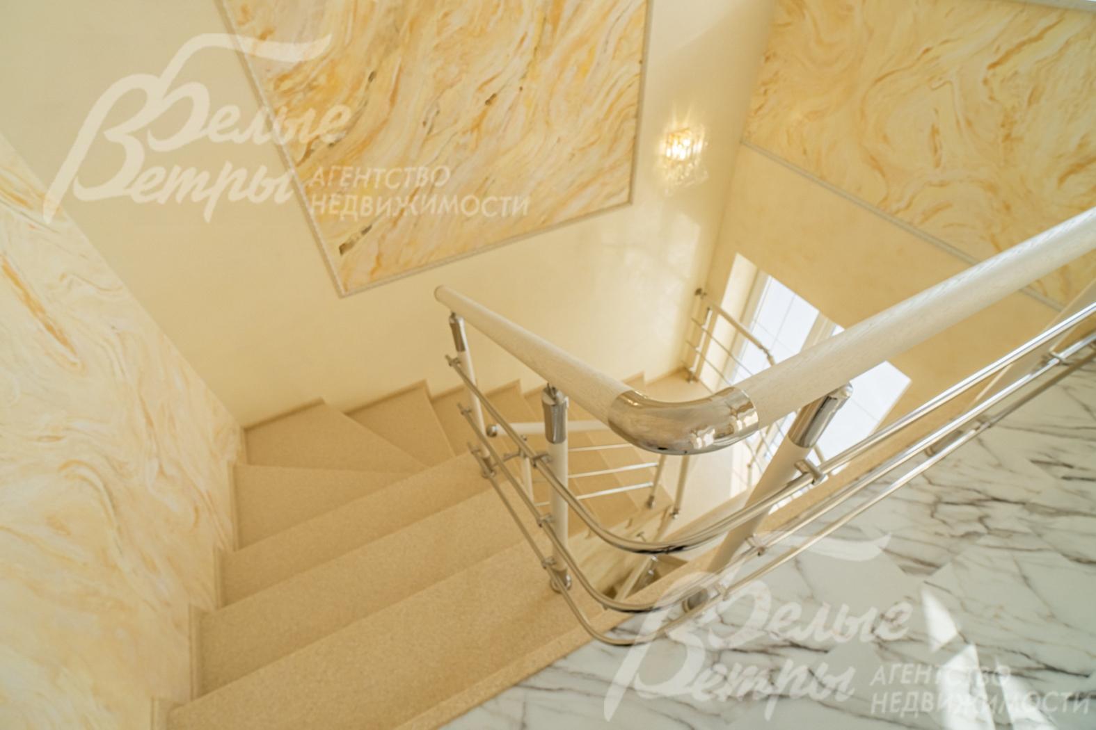 В зоне лестницы на стенах панно ручной работы с картинами под мрамор.