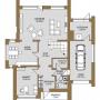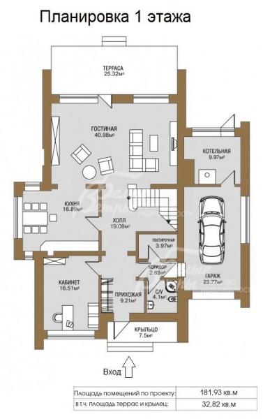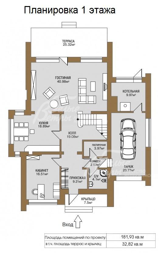 1-ый этаж: крыльцо 8 кв.м, прихожая 9 кв.м, холл 19 кв.м, гостиная с камином 41 кв.м и с выходом на террасу 25 кв.м, кухня-столовая 19 кв.м, кабинет/спальня 17 кв.м, коридор, санузел 4 кв.м, постирочная 4 кв.м, котельная 10 кв.м, гараж на 1 а/м 24 кв.м