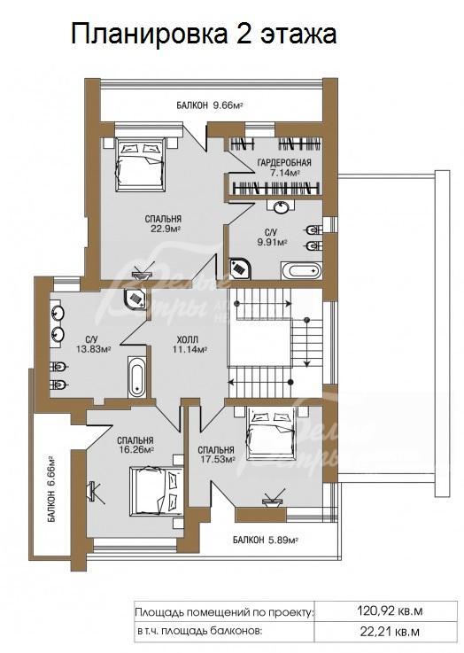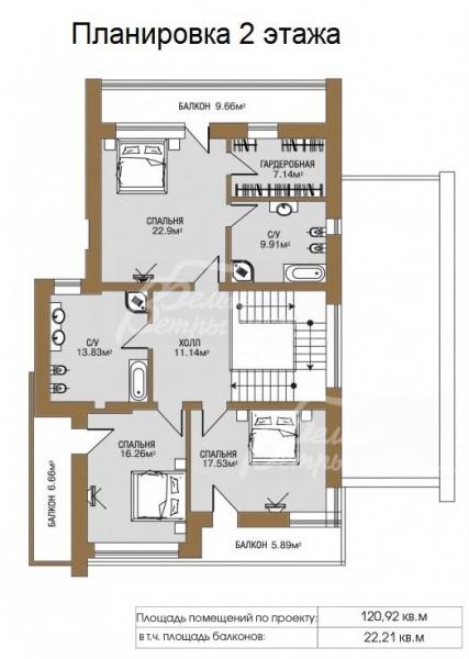 2-ой этаж: холл 11 кв.м, главная спальня 23 кв.м с гардеробной 7 кв.м с санузлом 10 кв.м и с выходом на балкон 10 кв.м, спальня 18 кв.м с выходом на балкон 6 кв.м, санузел 14 кв.м, спальня 16 кв.м с выходом на балкон 6 кв.м