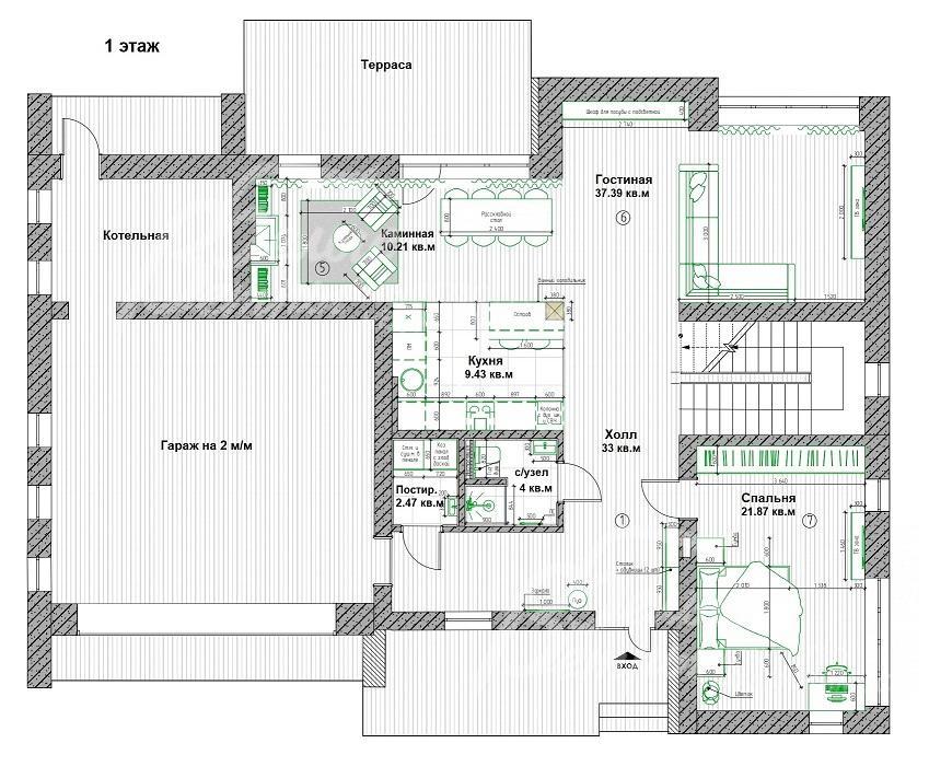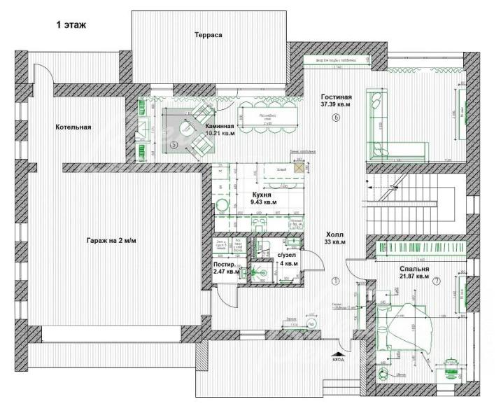 1-ый этаж: холл 33 кв.м, гостиная 37 кв.м, каминная зона 10 кв.м с выходом на террасу, кухня 9 кв.м, гостевая спальня-кабинет 22 кв.м, санузел с душем 4 кв.м. Вспомогательные помещения: отапливаемый гараж на 2 автомобиля, котельная, санузел, постирочная.